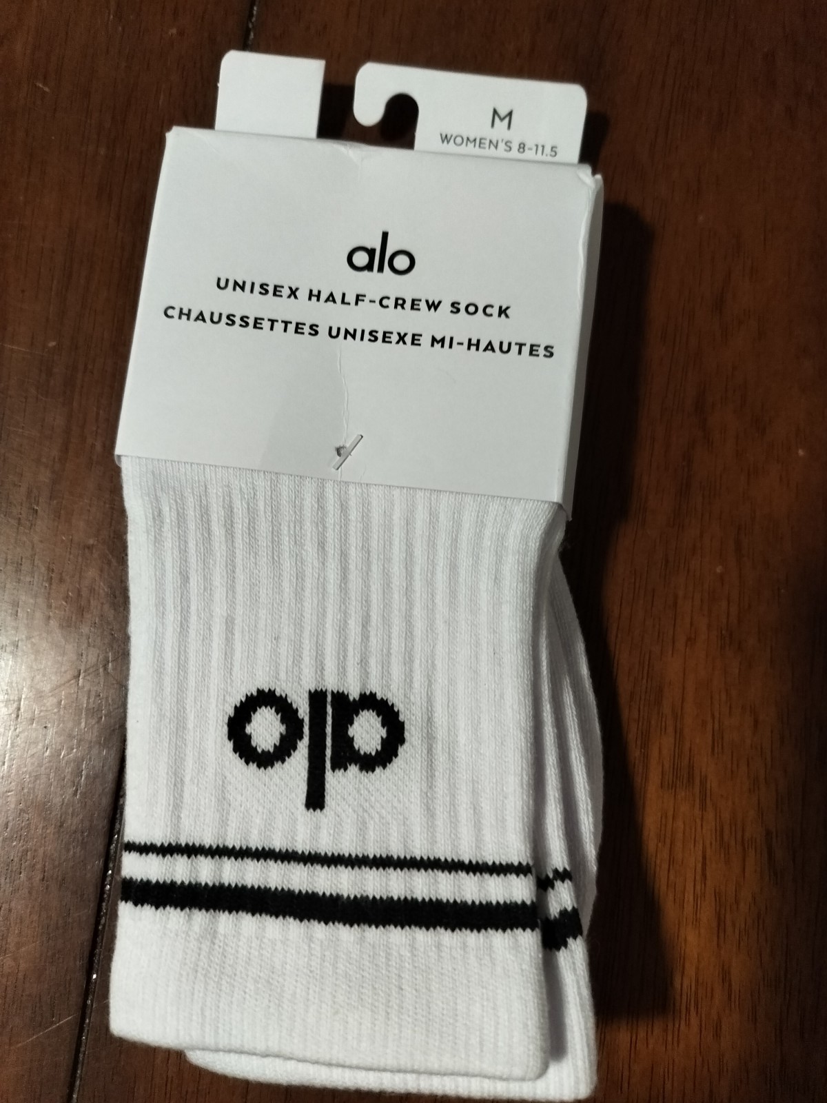 как выглядит Alo Unisex Throwback Crew Socks White Ribbed Logo NWT фото