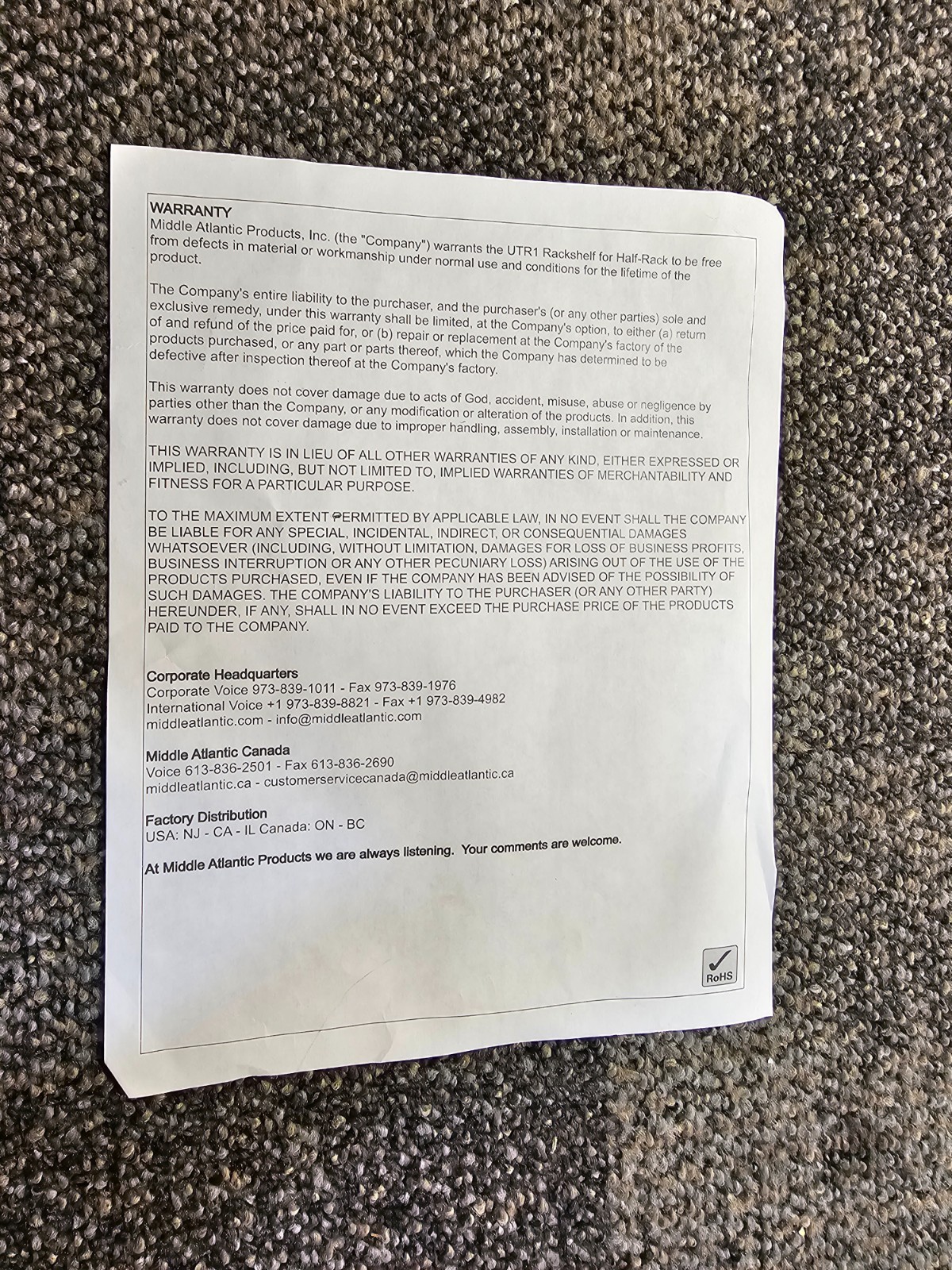Middle Atlantic UTR1 Rack Shelf, 1-3/4 in H x 19 in W x 10 in D, 25 lb Capacity