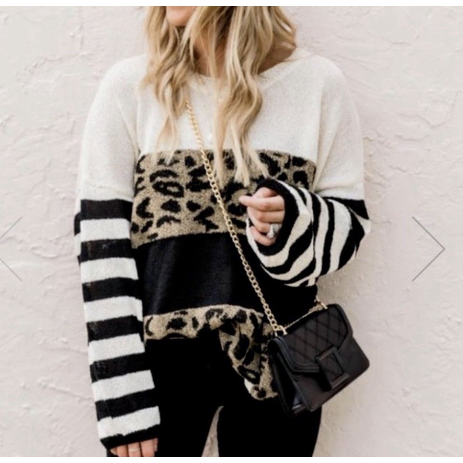 Boho Animal Print Striped Women Sweater Sz M Loose Fit Cozy Open Knit Beige Tan