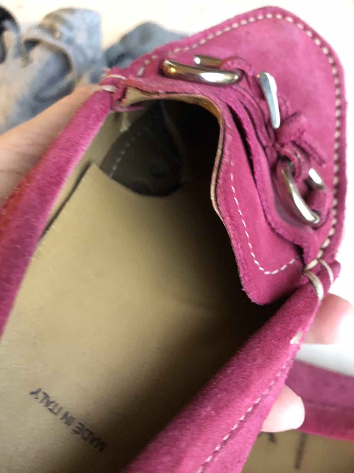 Read Prada Women's Pink Suede Logo Driving Loafers Size 36