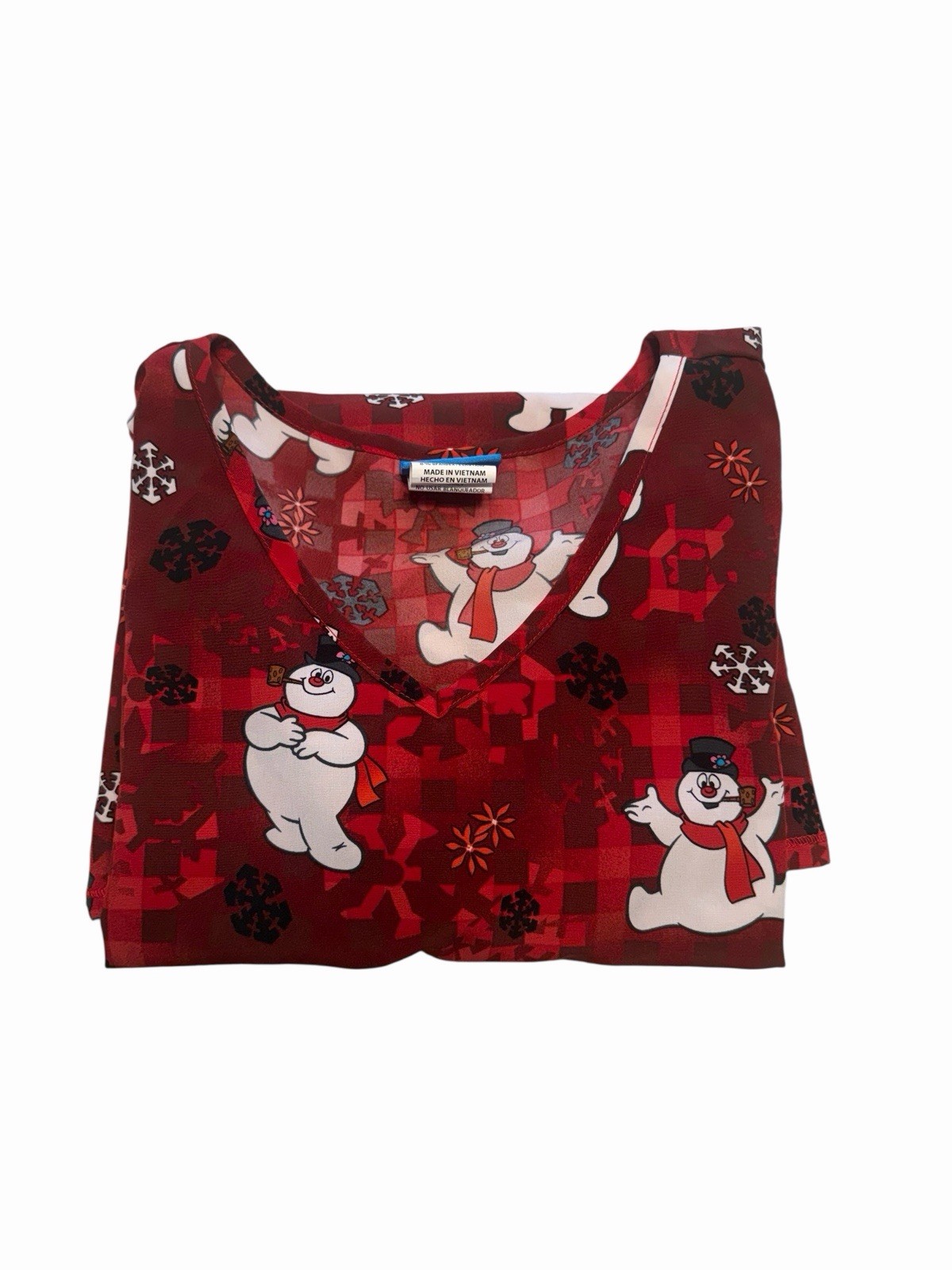 Frosty The Snowman Scrub Top Women's Size Large Red Black White Christmas