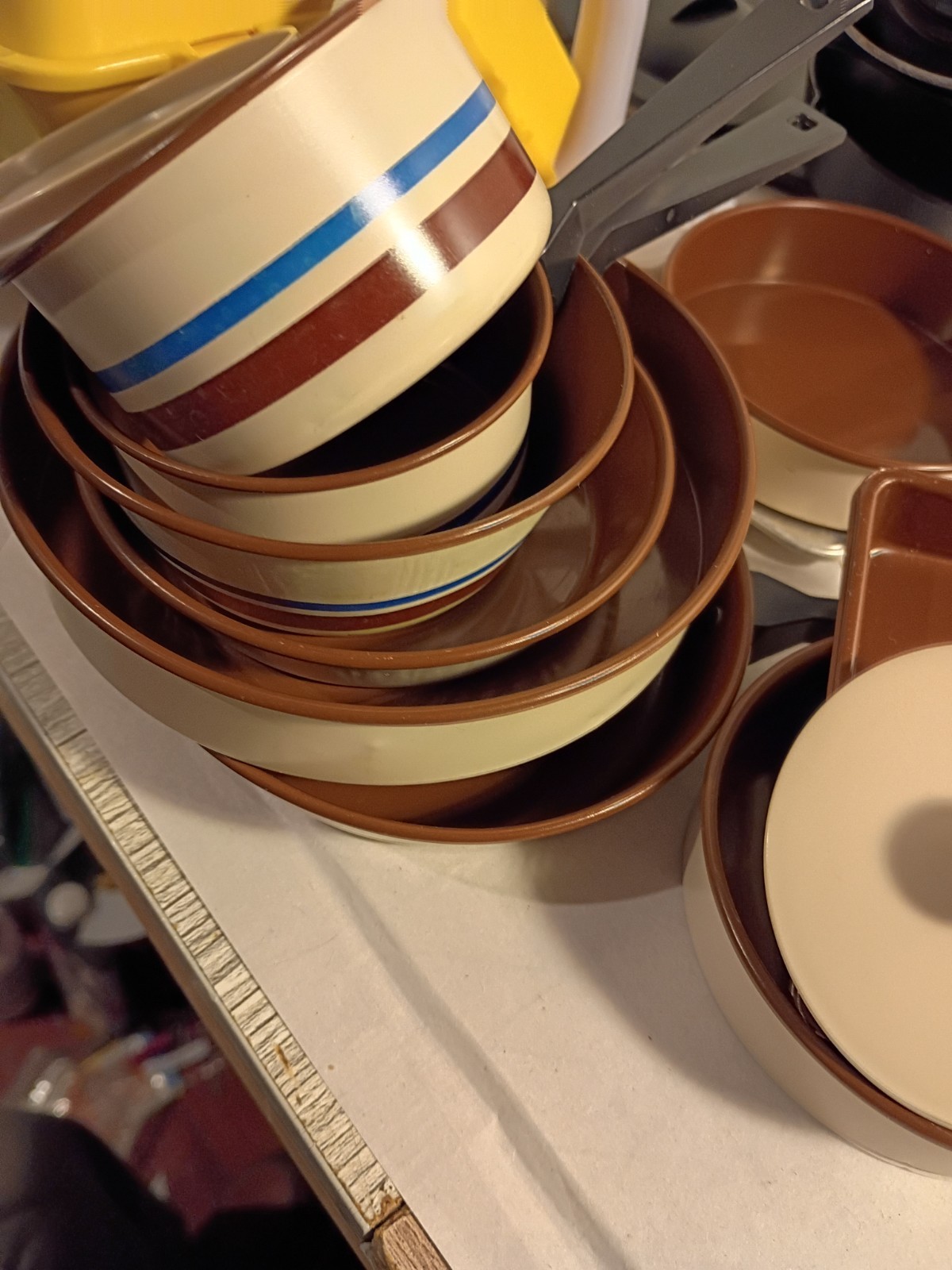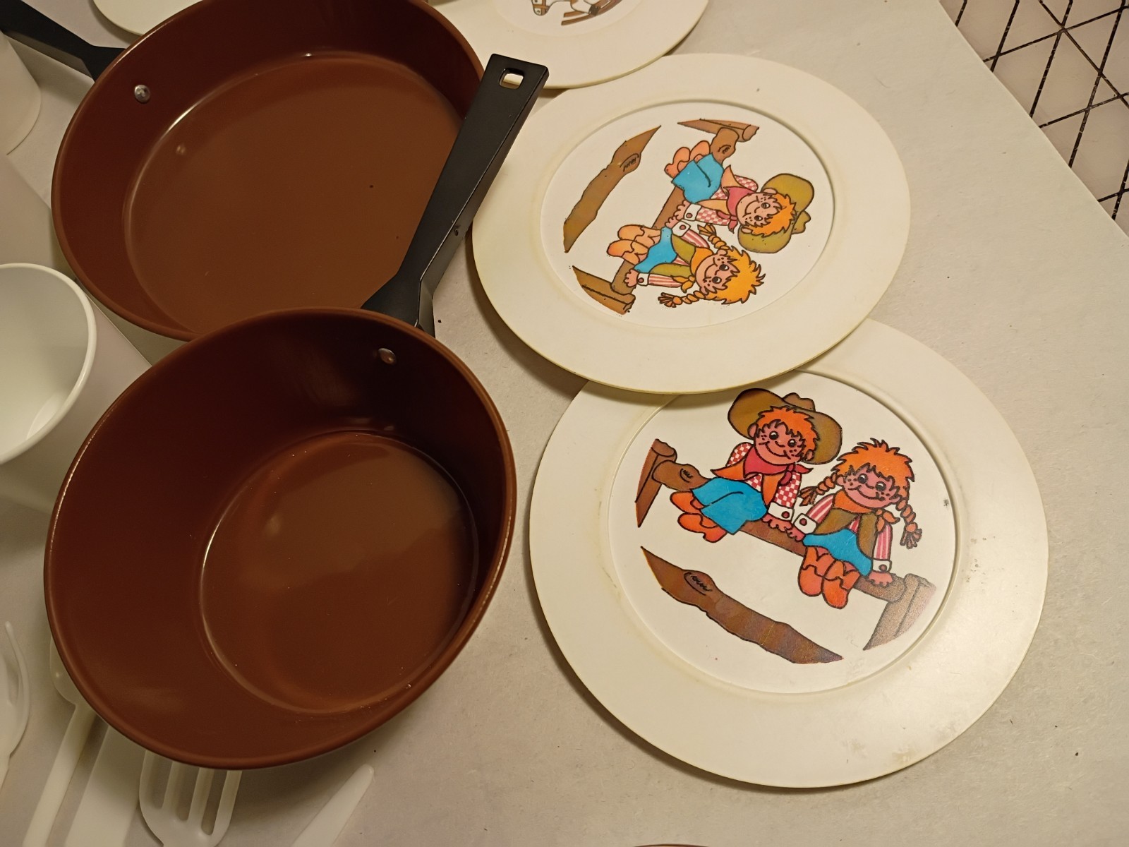 как выглядит Huge Vtg Chilton Childs Toy Set Pots, Pan Black/Brown/Tan Collectible Aluminum фото