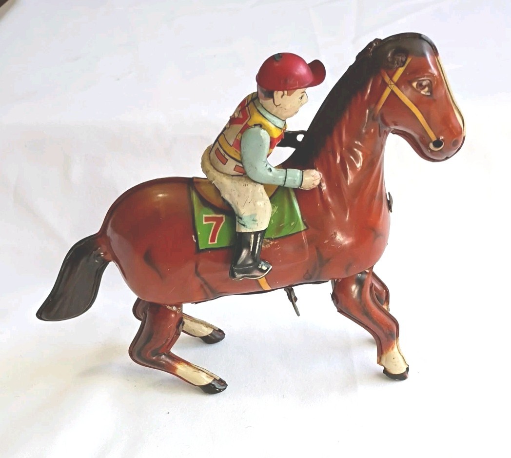 Wind Up Mechanical Tinplate Horse with Jockey Rider Haji Japan 50s