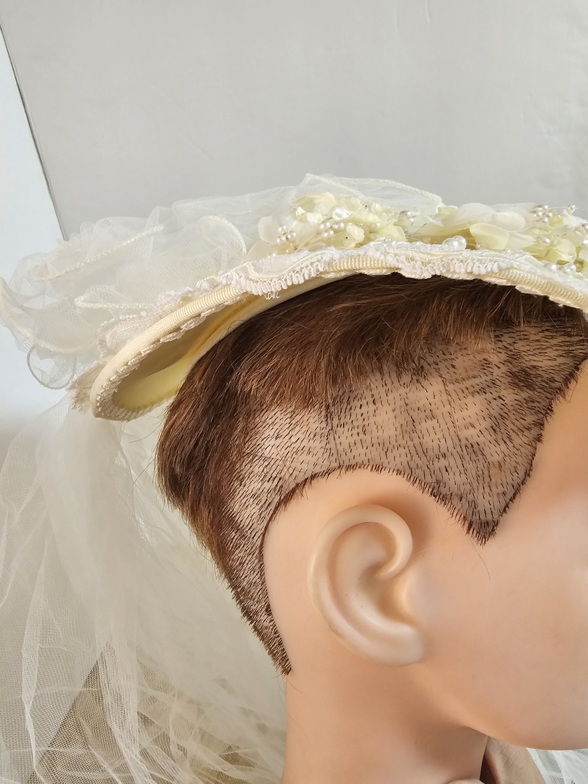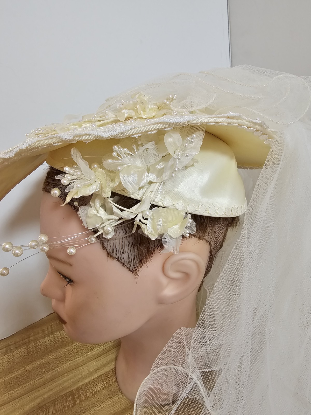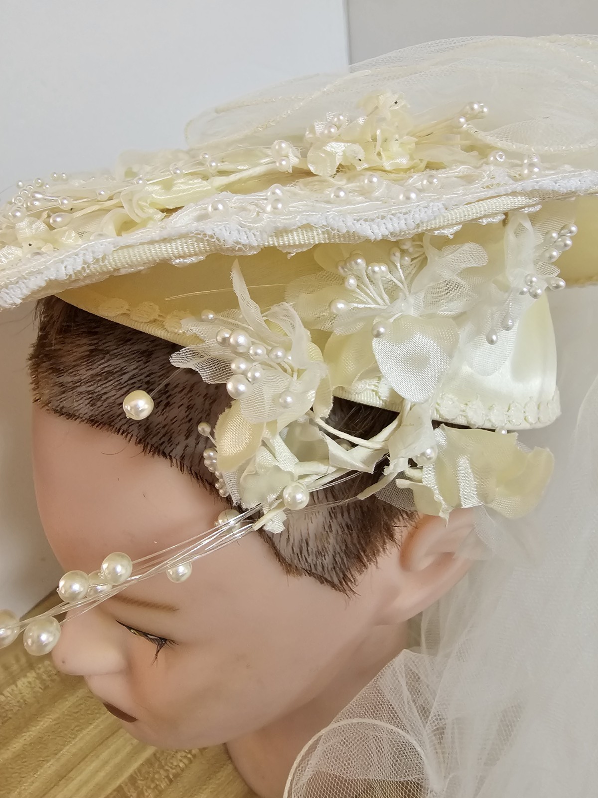 как выглядит Vtg Ivory Bridal Wedding Hat Tier Tulle Veil Pearl Beaded Headdress Minor Aging фото