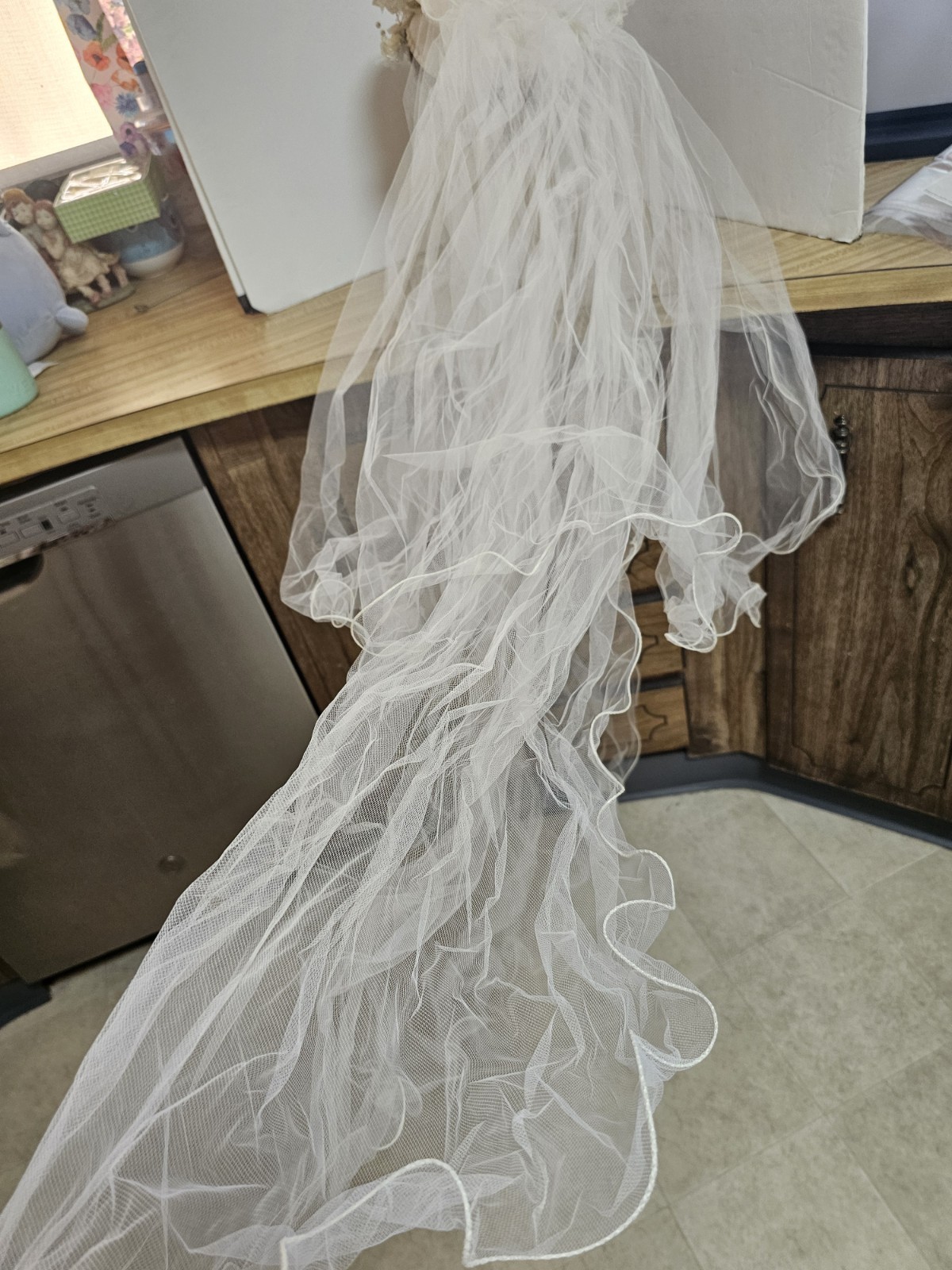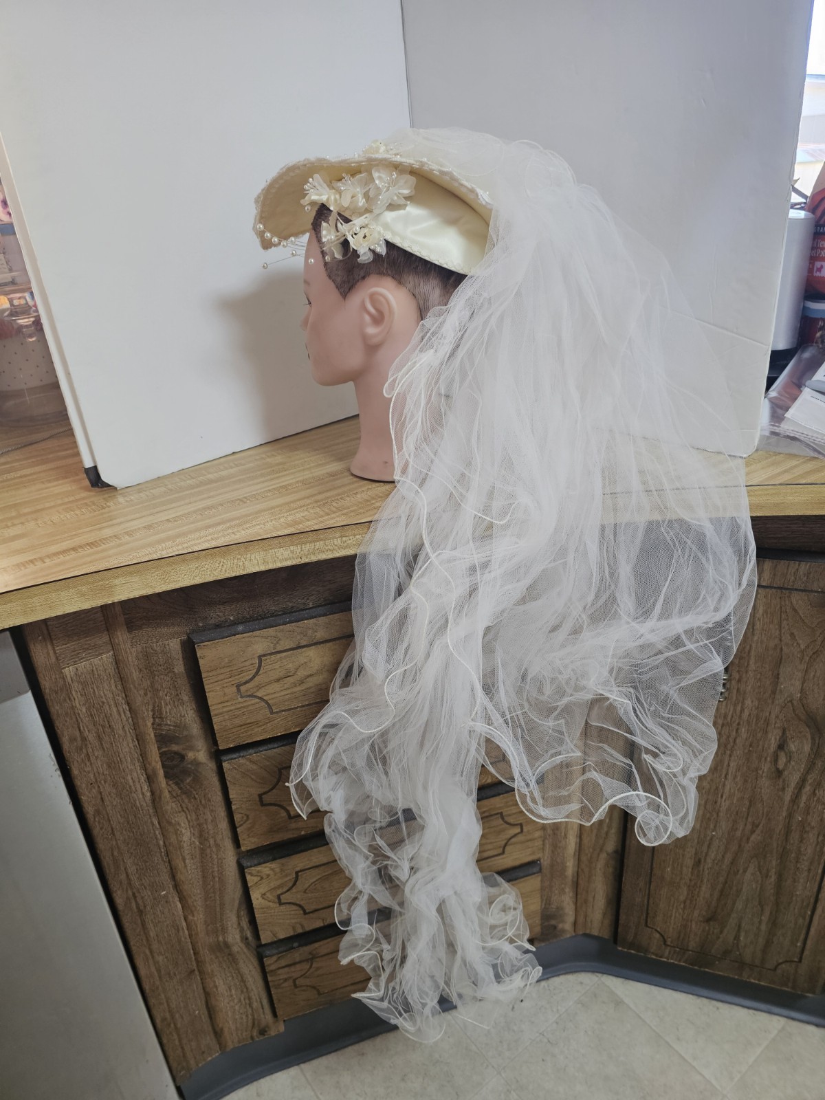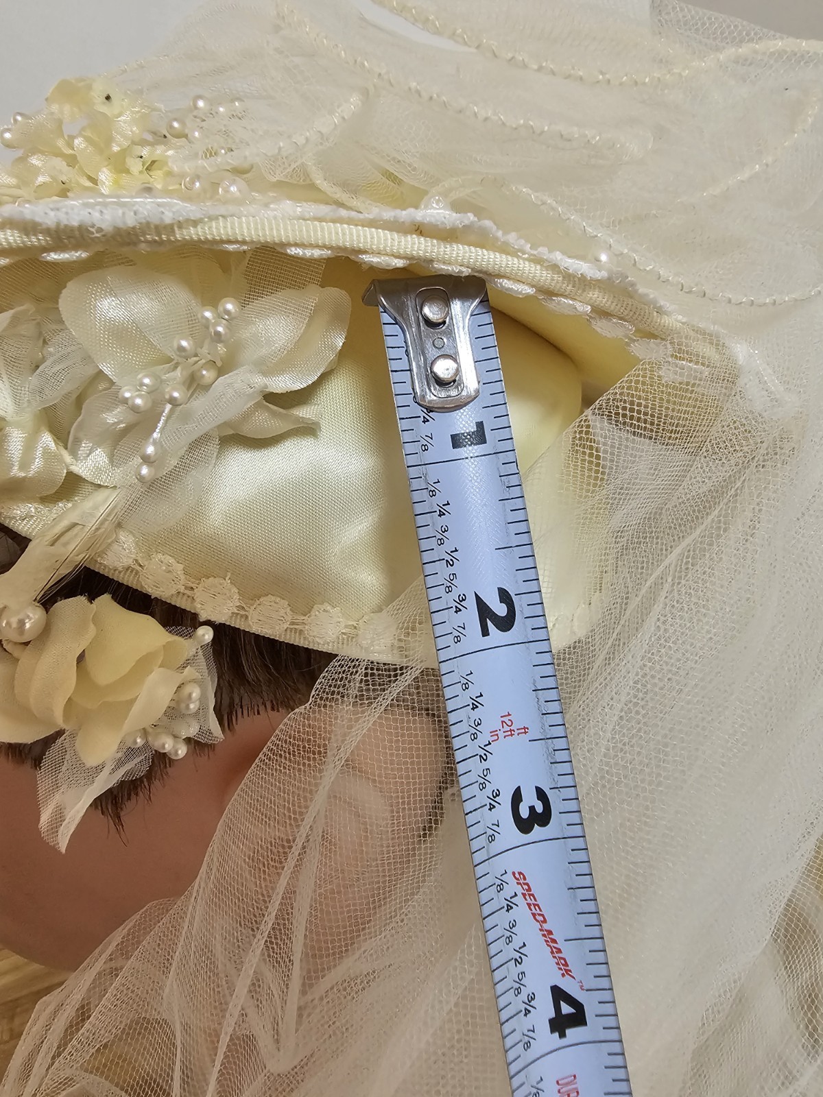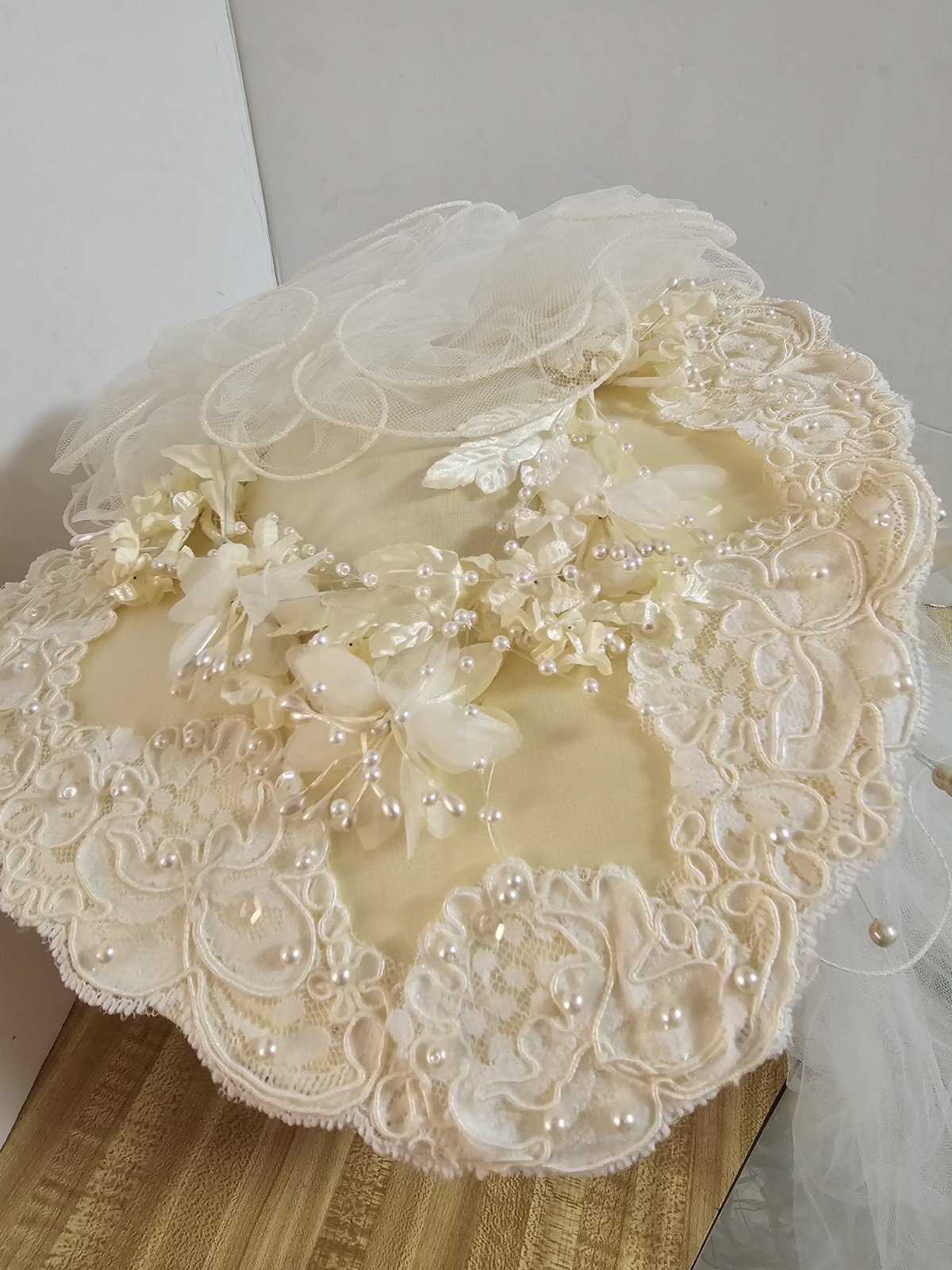 как выглядит Vtg Ivory Bridal Wedding Hat Tier Tulle Veil Pearl Beaded Headdress Minor Aging фото