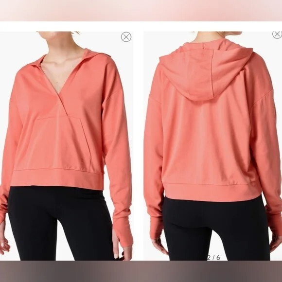 как выглядит Sweaty Betty After Class Cropped Pullover Hoodie Small Sweatshirt Coral Pink фото