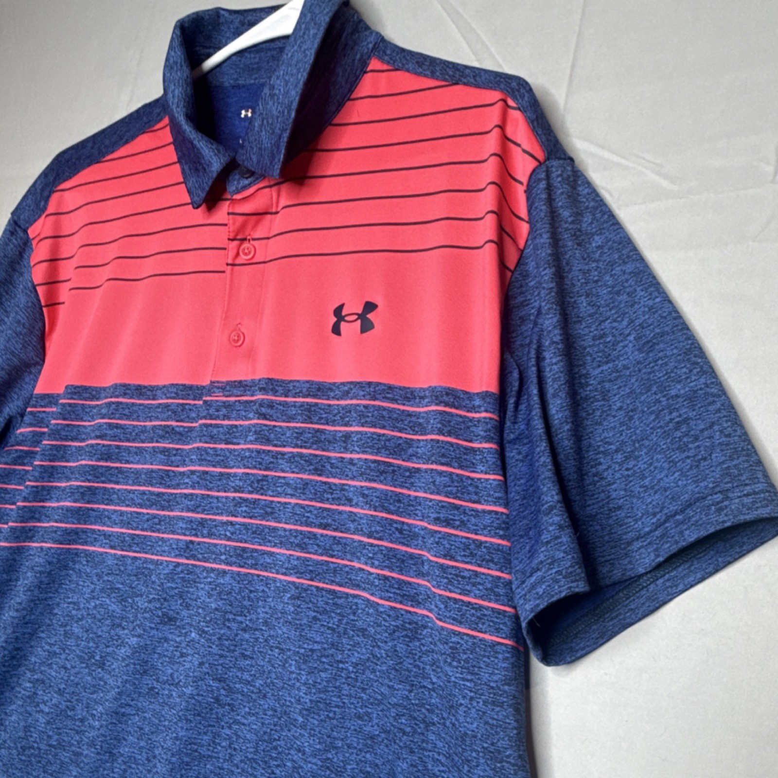 Under Armour The Playoff Polo Men's XL Blue Pink Striped Loose Fit Short Sleeve