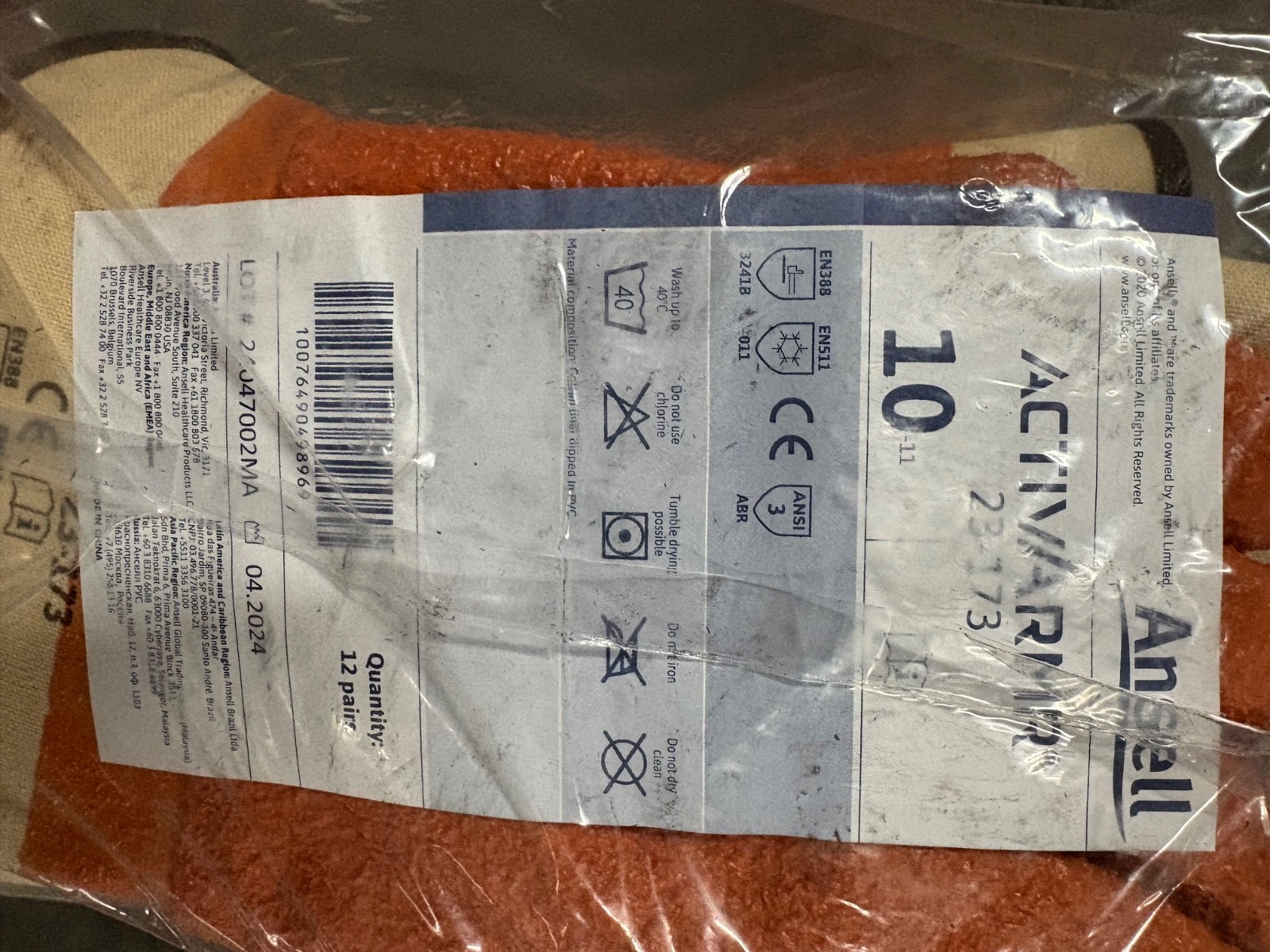 Ansell ActivArmr 23-173 Safety Work Gloves Size 10 Cold Protection 12 Pairs