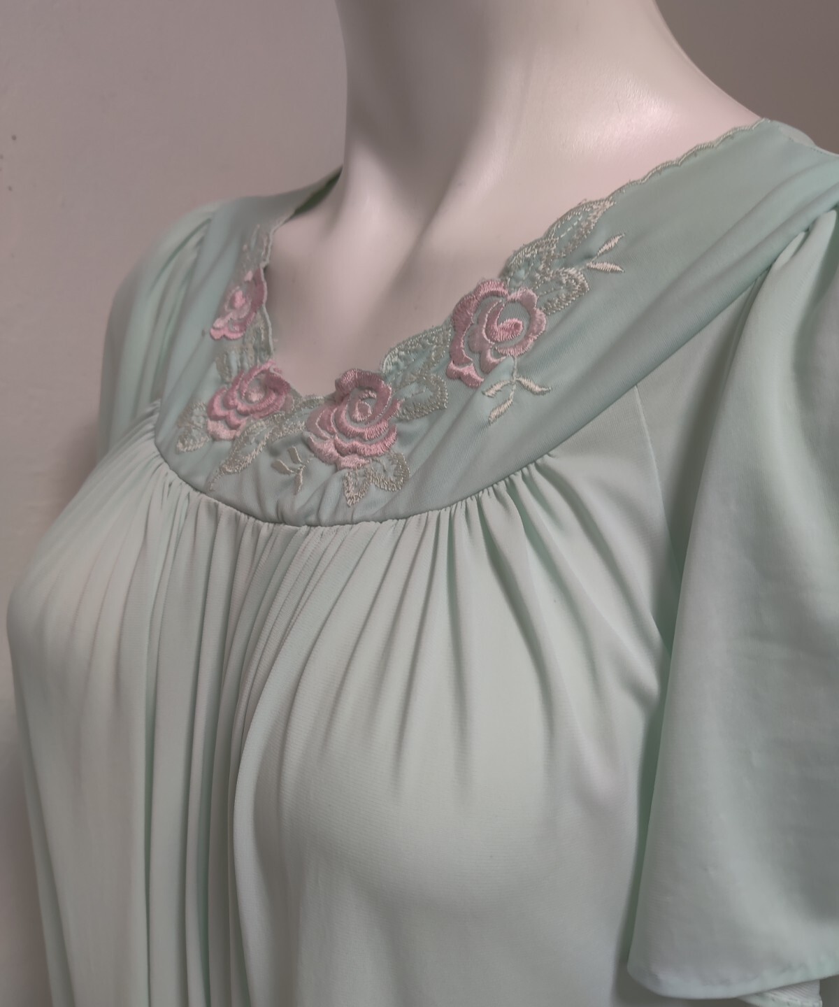 Vintage Shadowline Long Nightgown Small Aqua Green Embroidered Floral Flaw