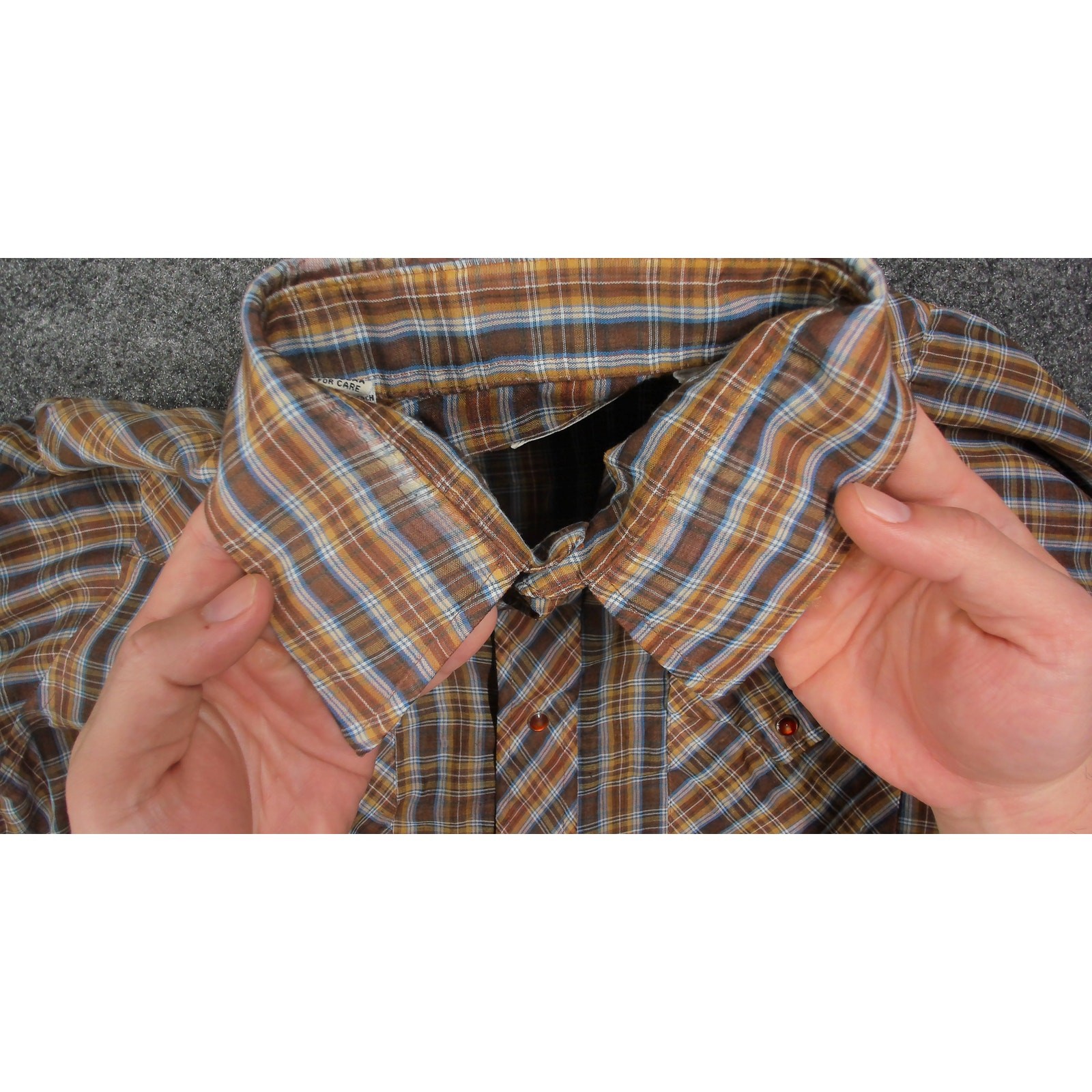 как выглядит 80s Wrangler Pearl Snap Western Shirt Brown Plaid Long Tail Mens Medium фото
