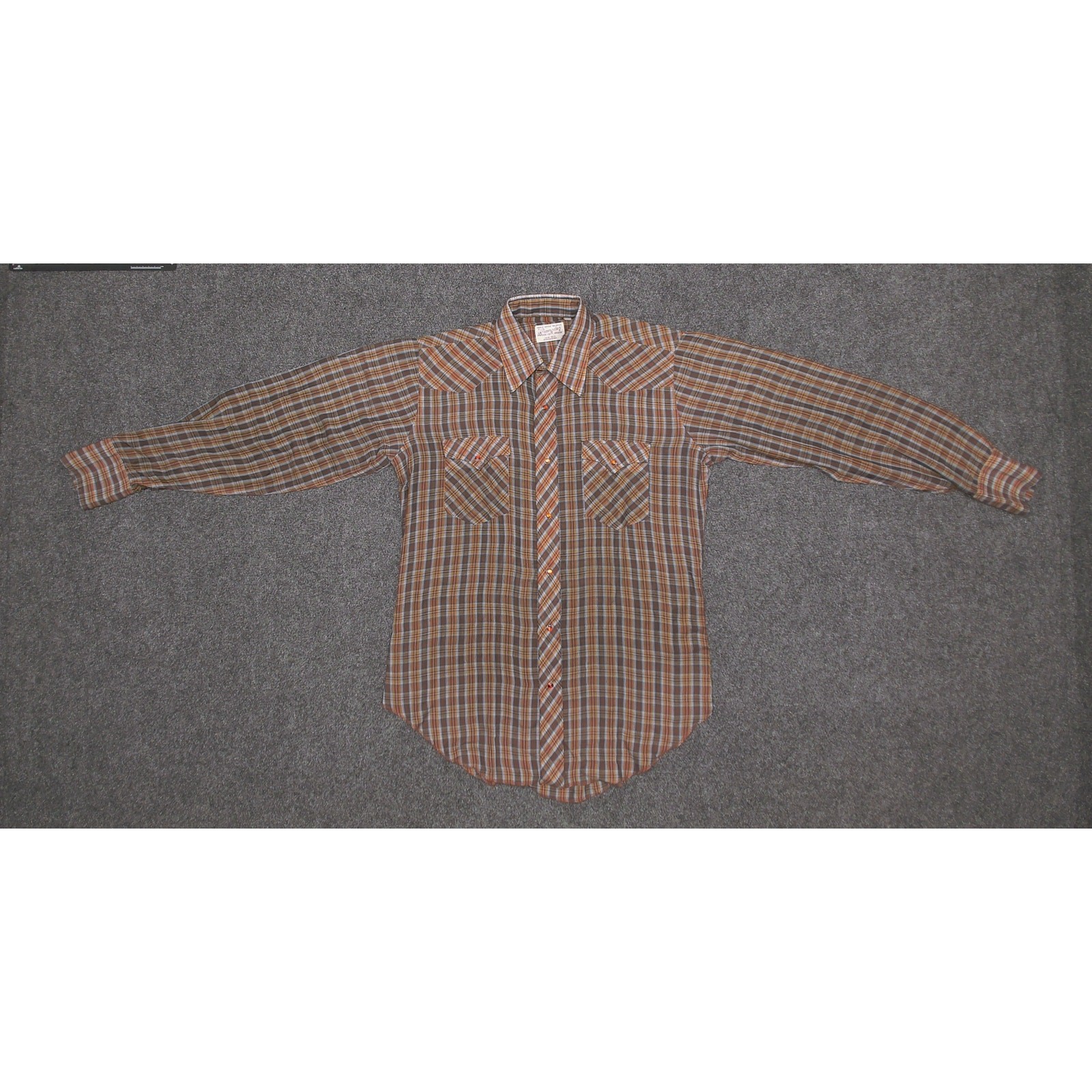 80s Wrangler Pearl Snap Western Shirt Brown Plaid Long Tail Mens Medium