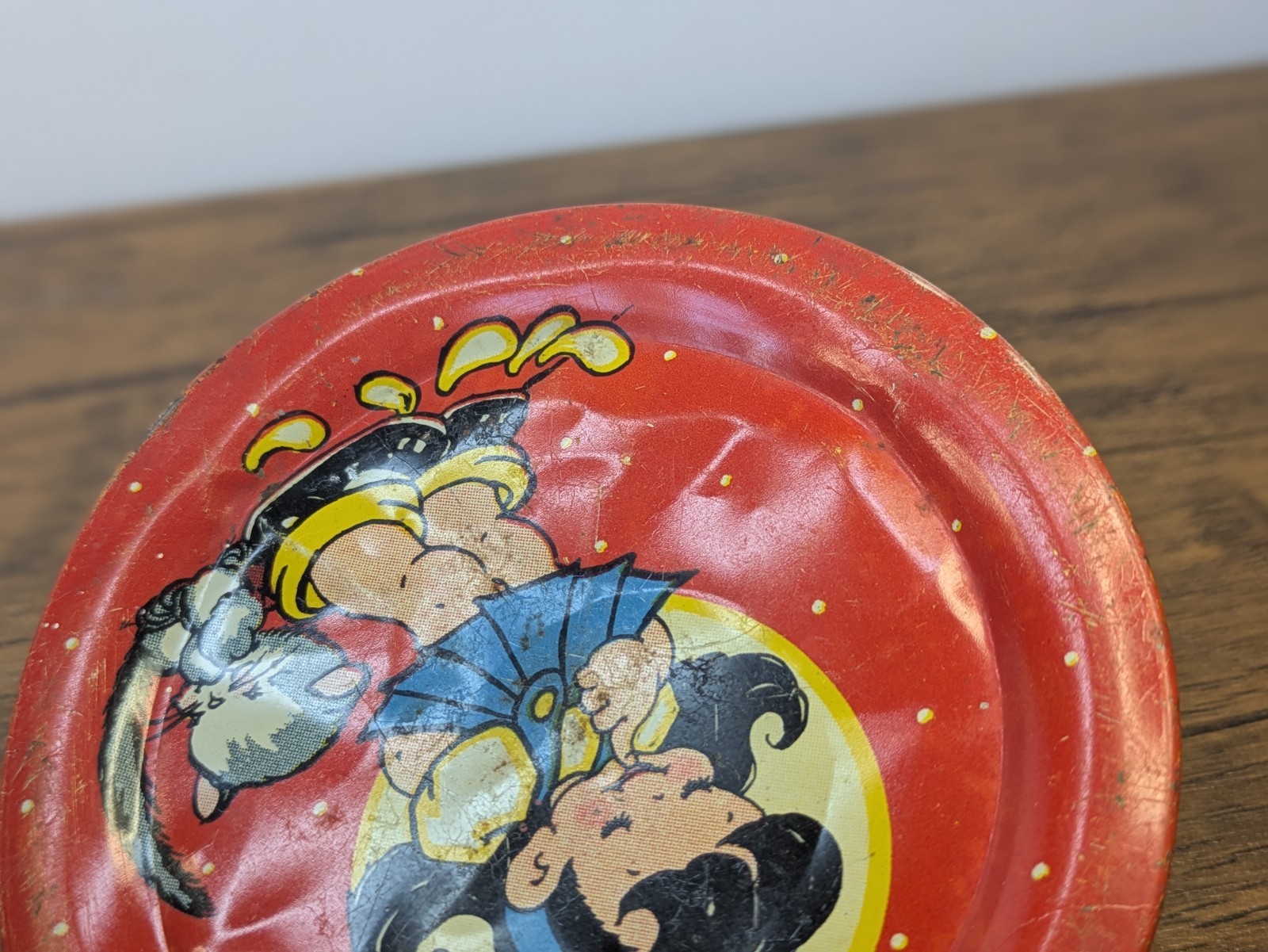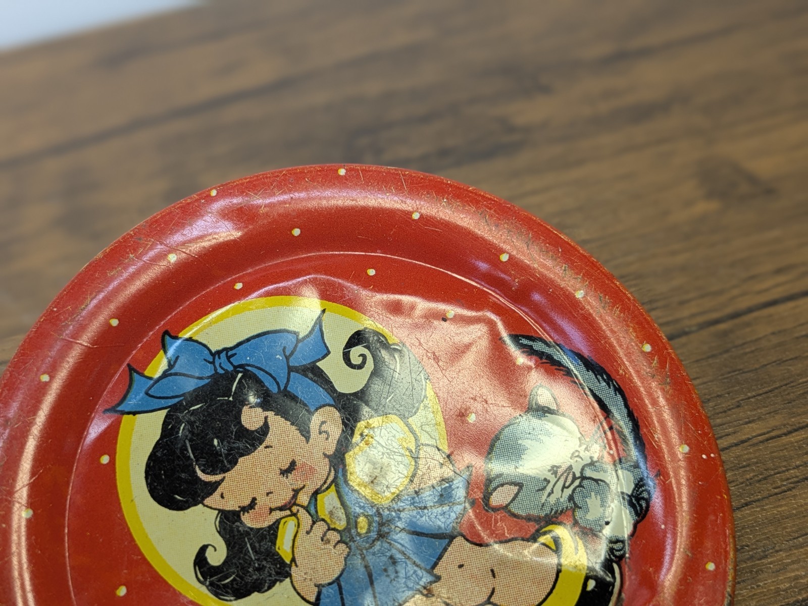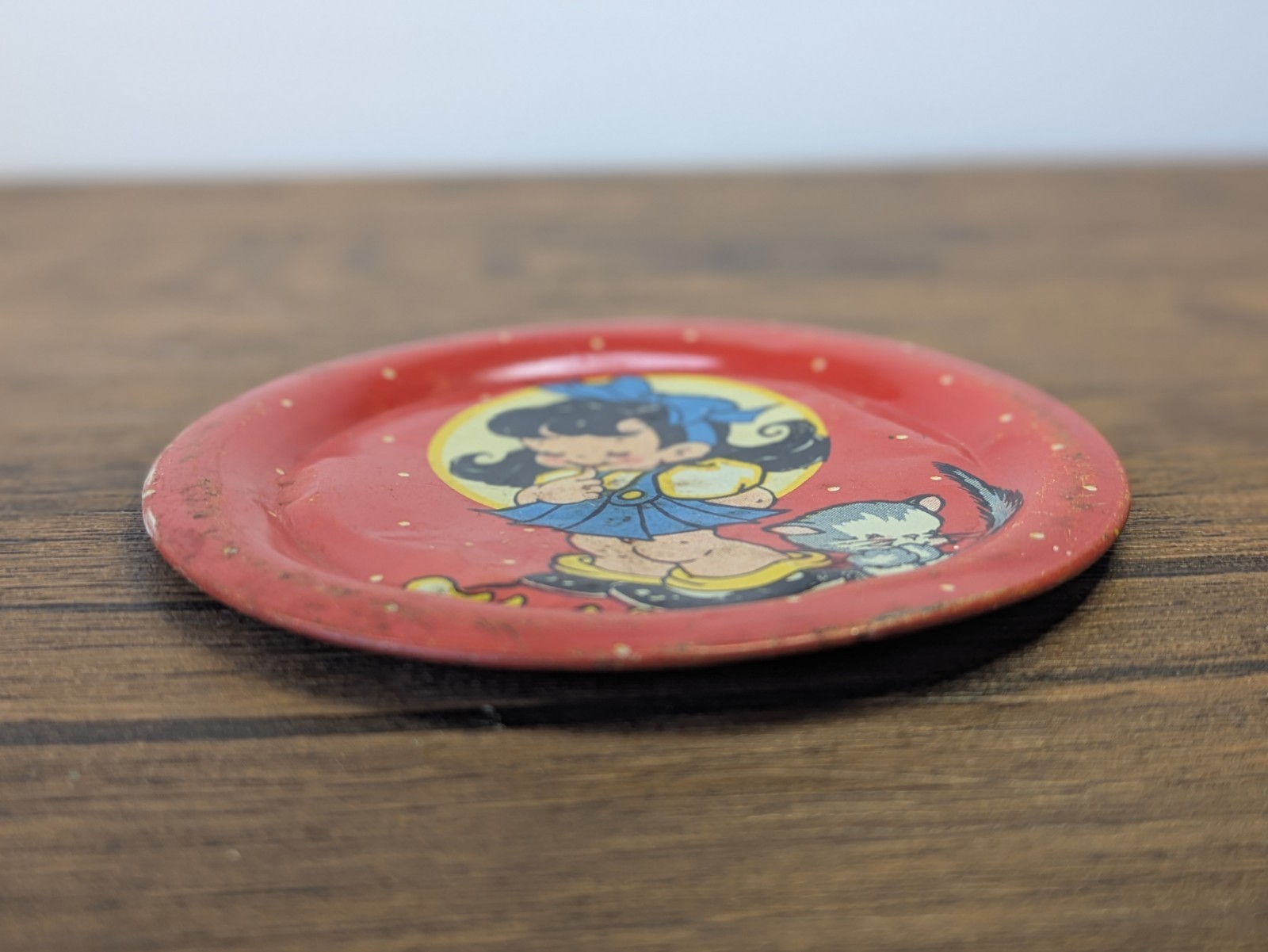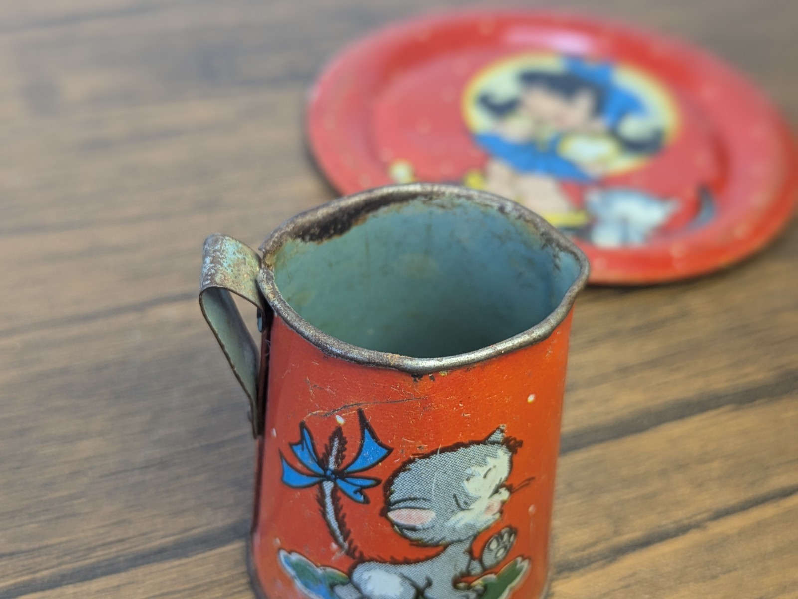 как выглядит Vintage - 1940 Ohio Art Tin Lithograph 2 Piece Tea Set, Red Girl Kitten фото
