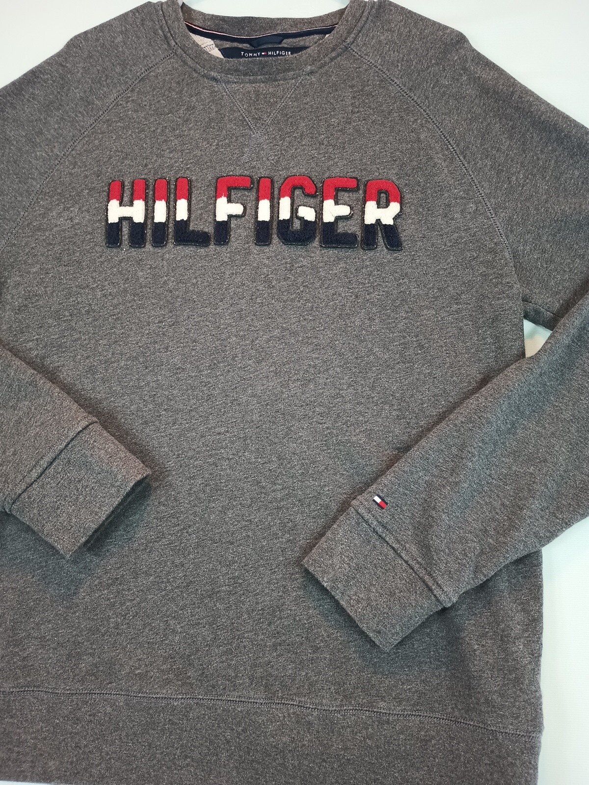 Tommy Hilfiger mens Sweatshirt L Gray Long Sleeve Pullover spell out vintage Y2K