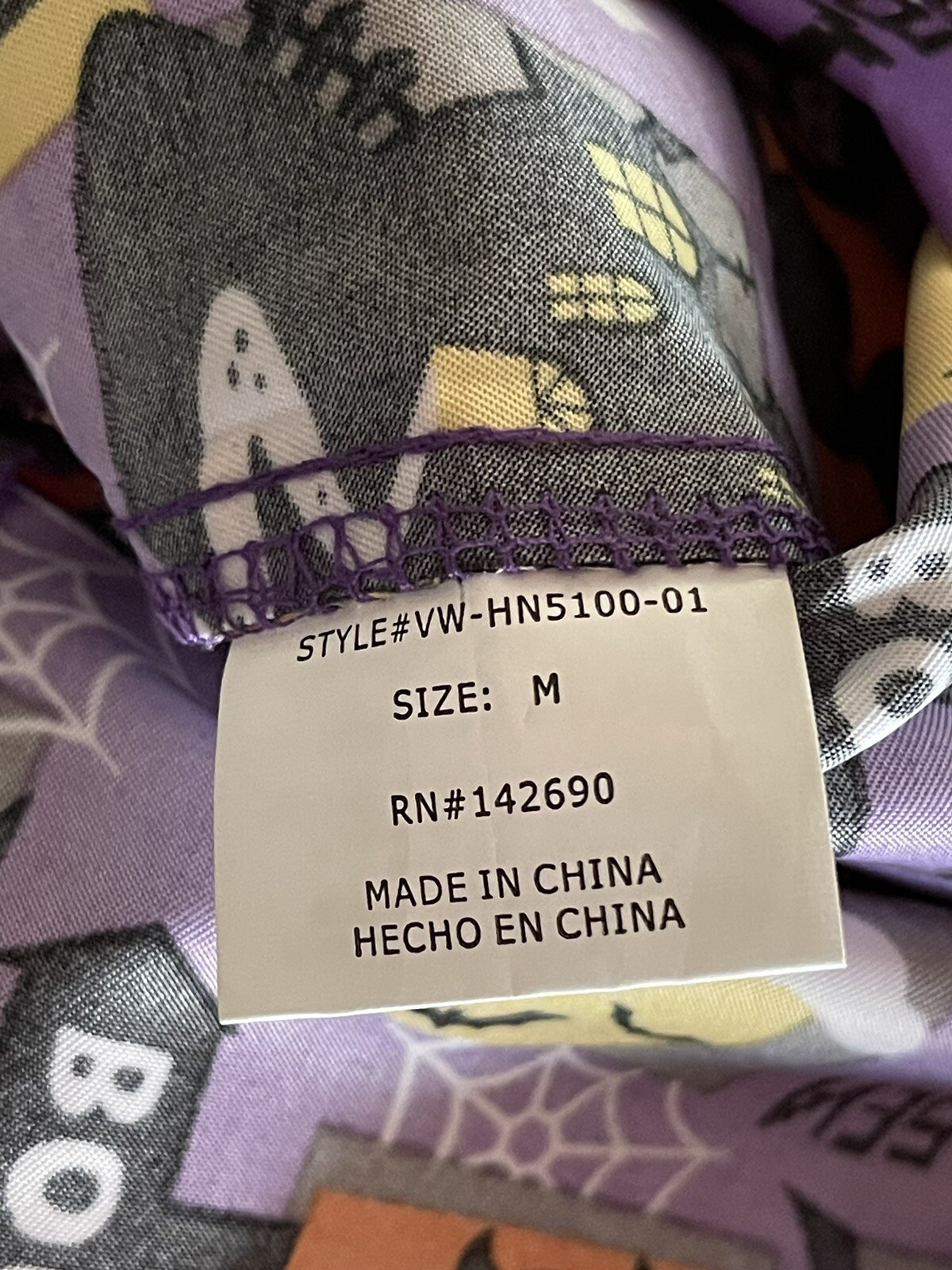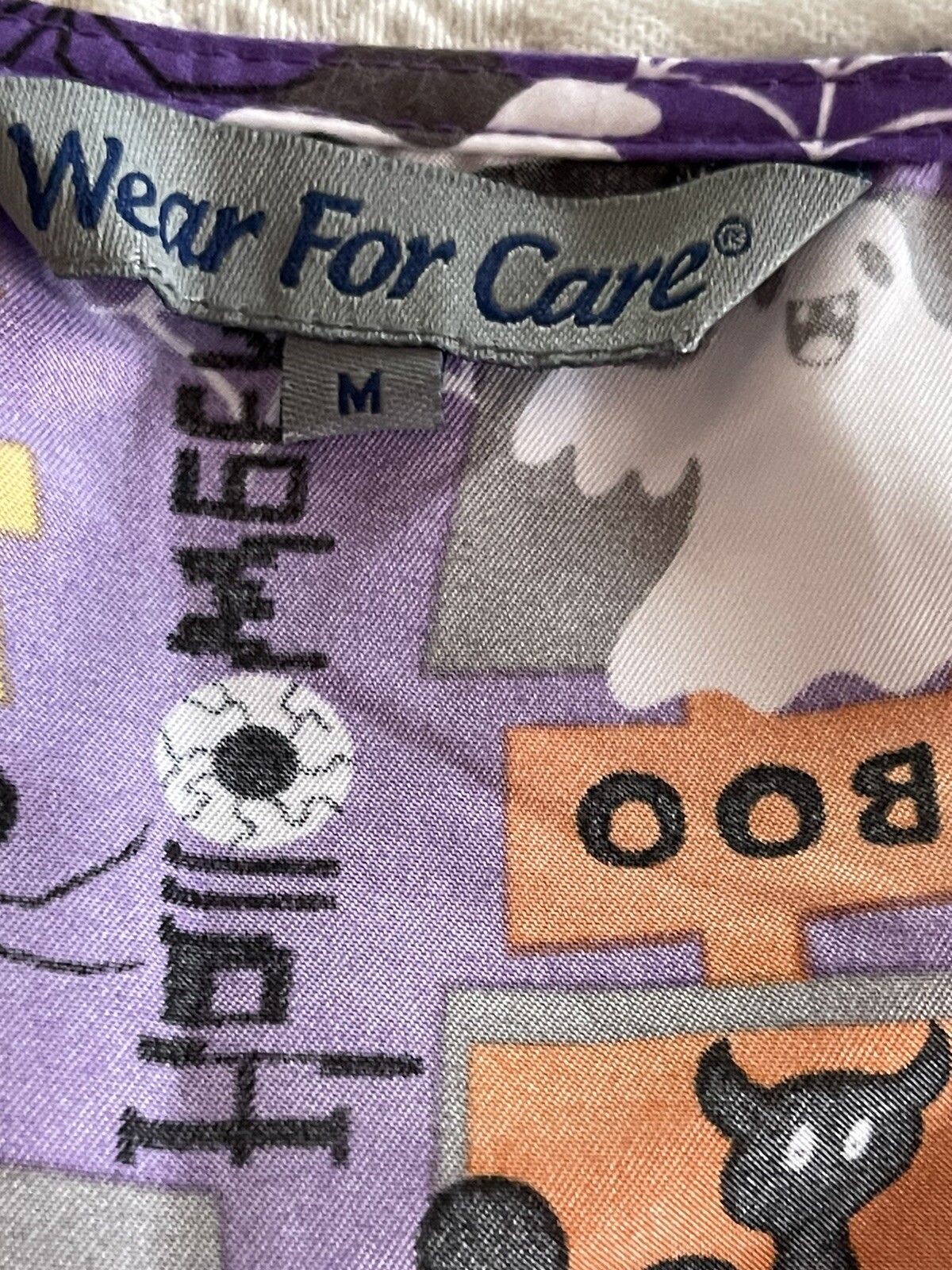 как выглядит Halloween Purple Scrub Top V-Neck Wear for Care Ghost Bats Black Cat Boo Medium фото