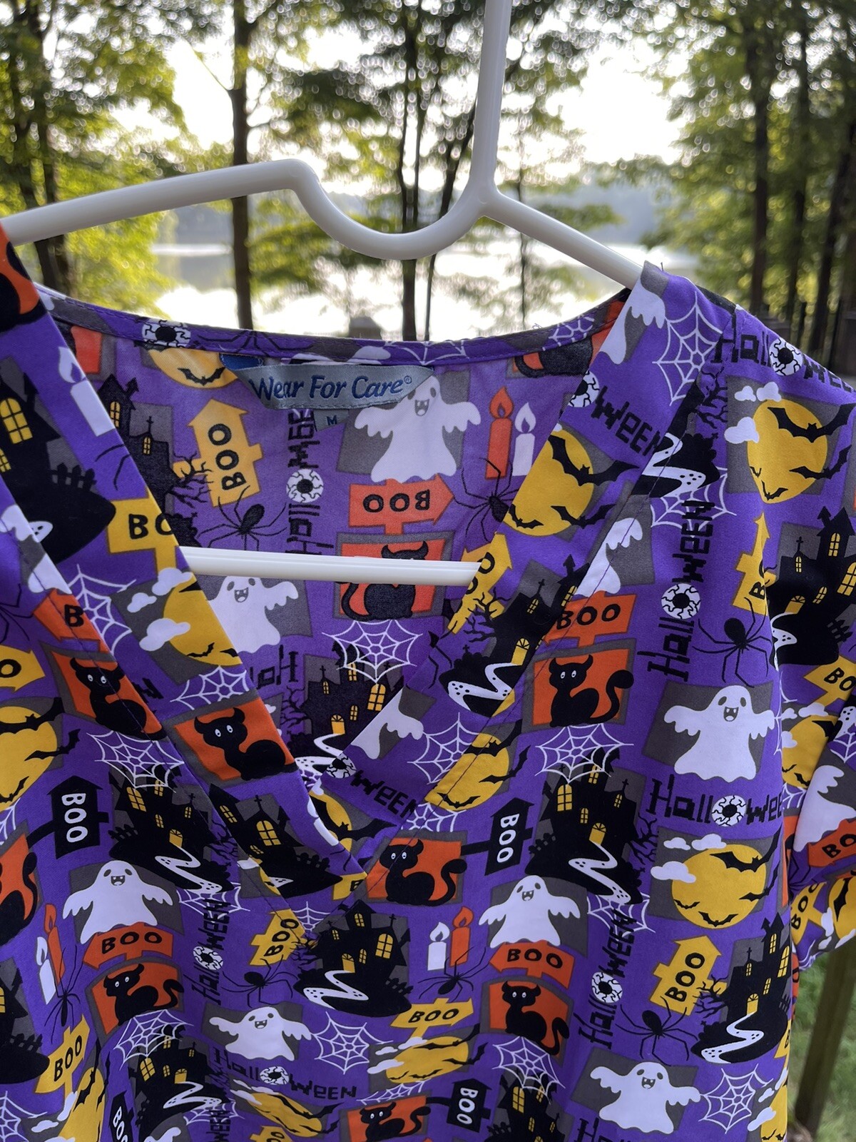 Halloween Purple Scrub Top V-Neck Wear for Care Ghost Bats Black Cat Boo Medium