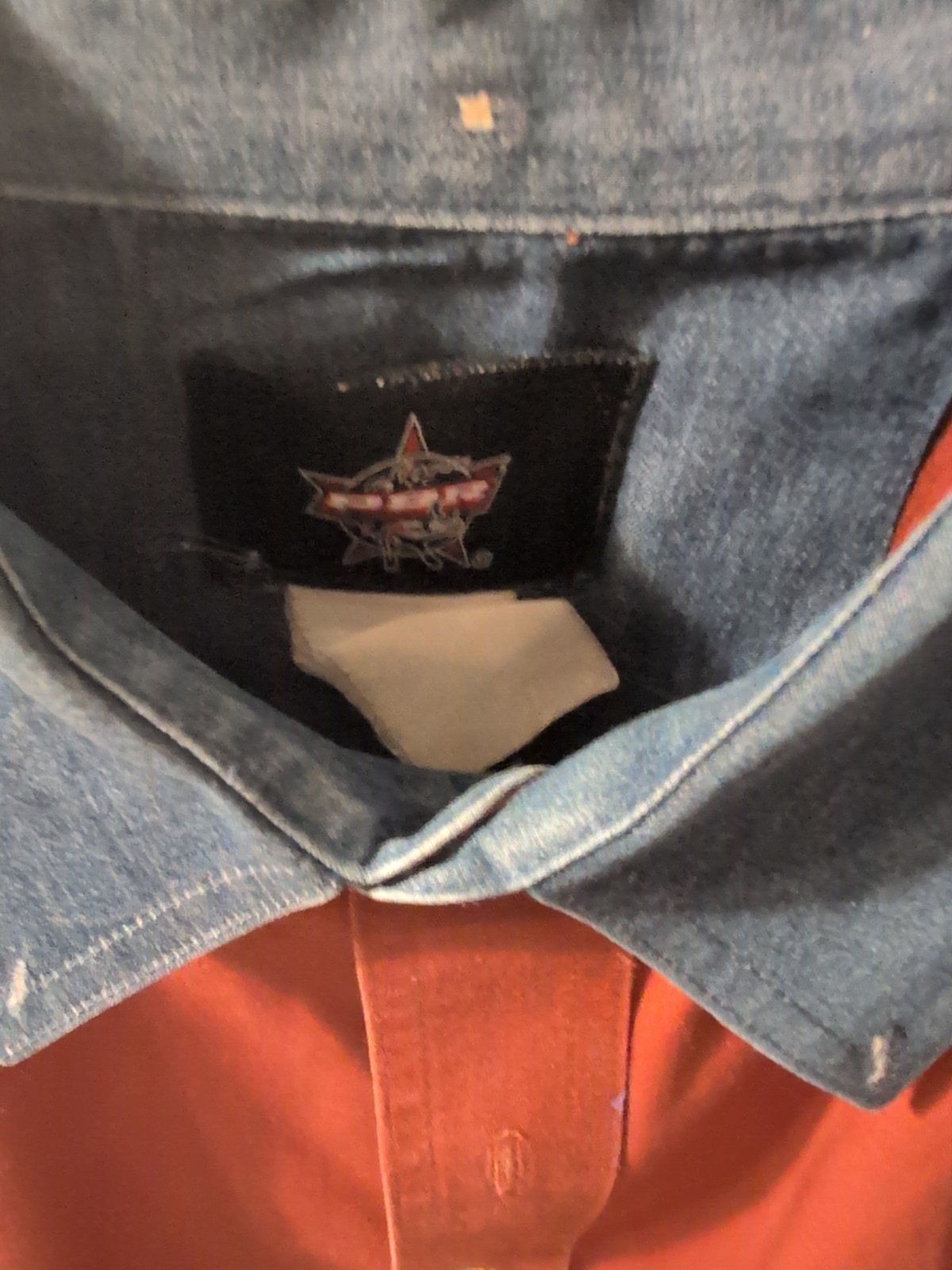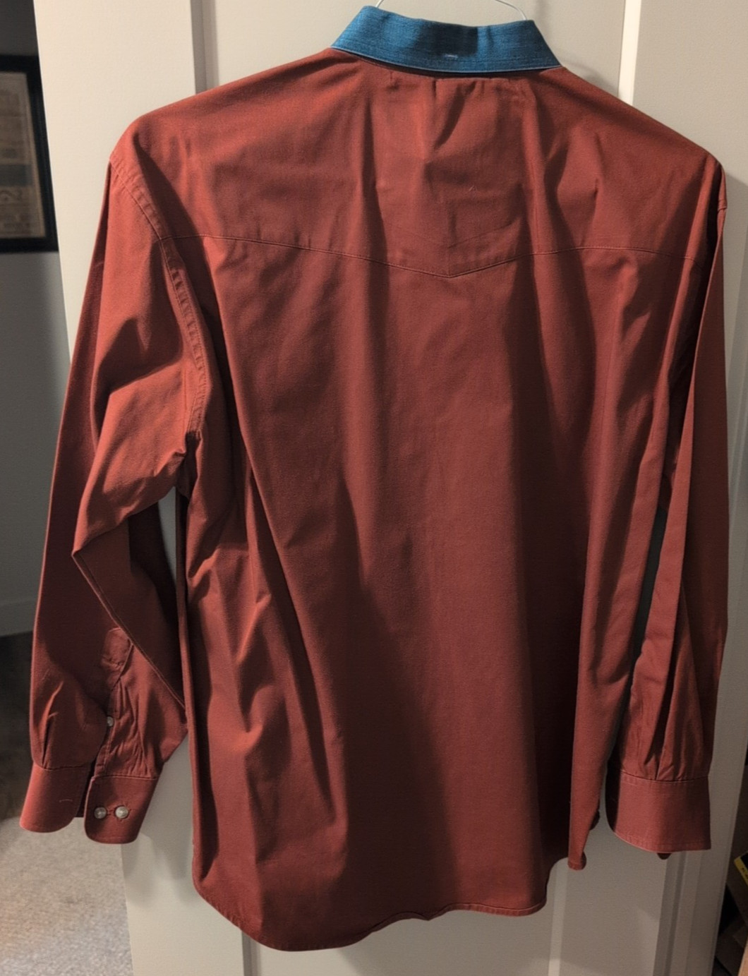 как выглядит Wrangler PBR Shirt Mens L Rust/Brown w/ Denim Collar Western Rodeo Cowboy фото