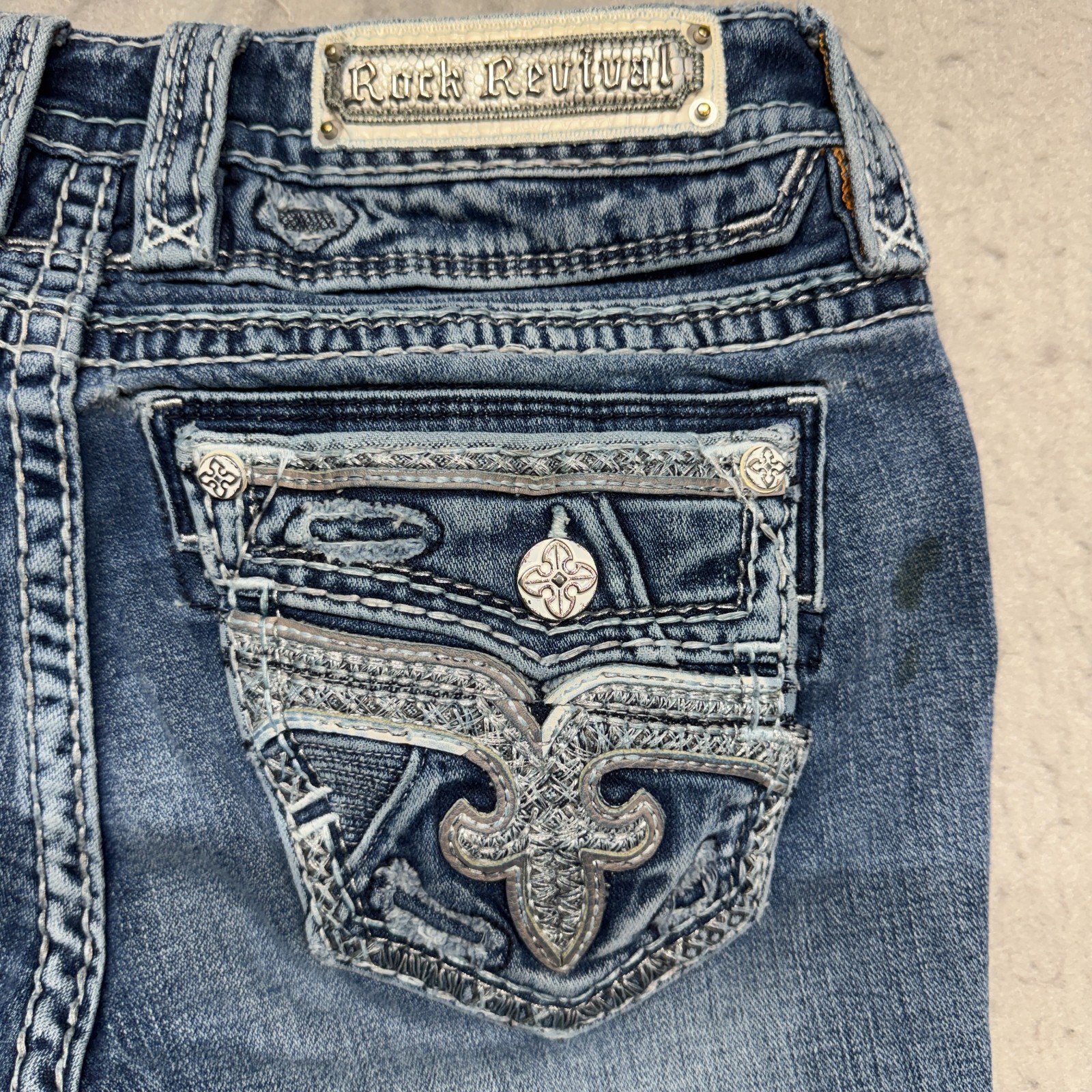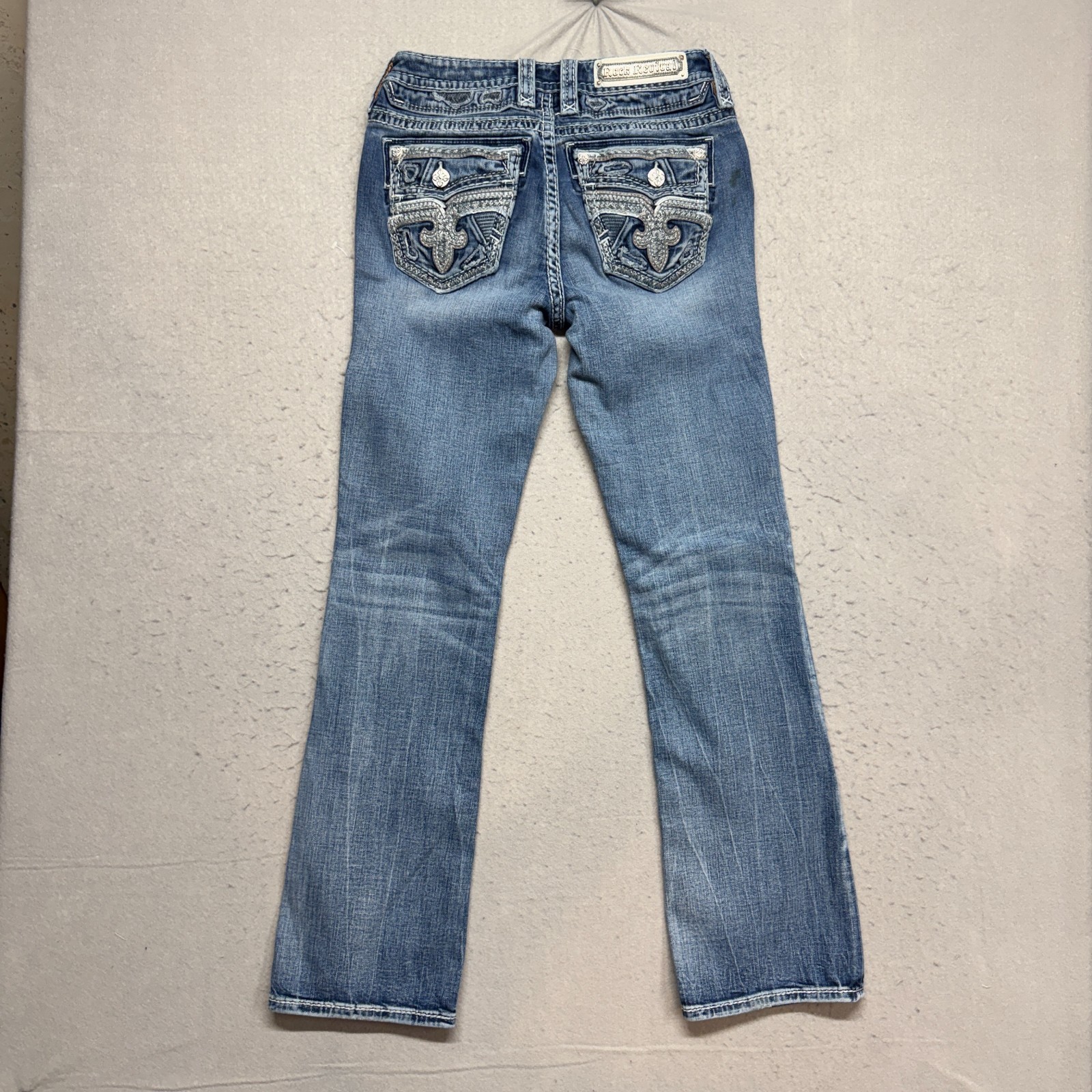 Rock Revival Women's Cecily Bootcut 28 Jeans Blue Distressed Embroidered Pockets