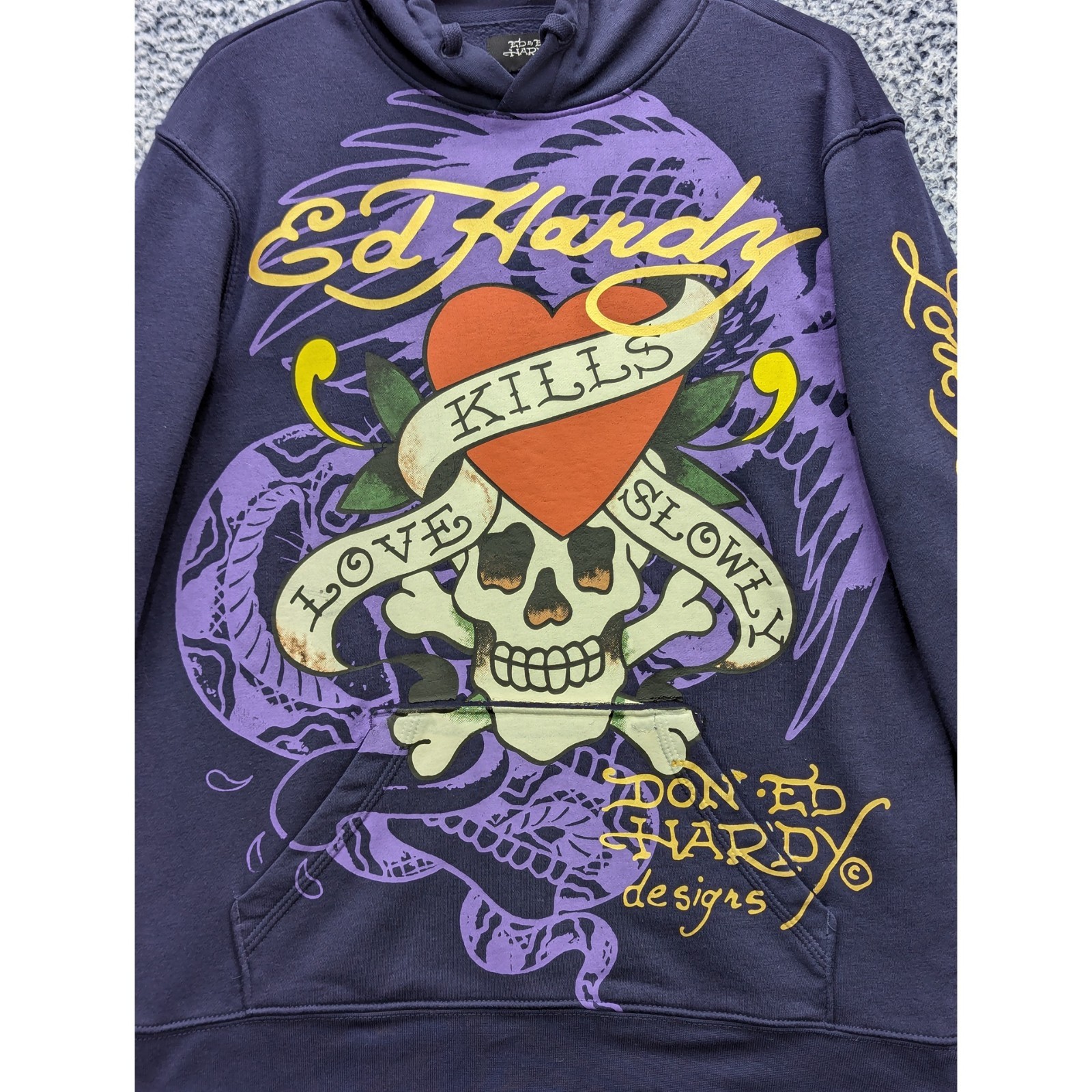 Ed Hardy Y2K Love Kills Slowly Hoodie Size S Double Sided Graphic Punk Purple