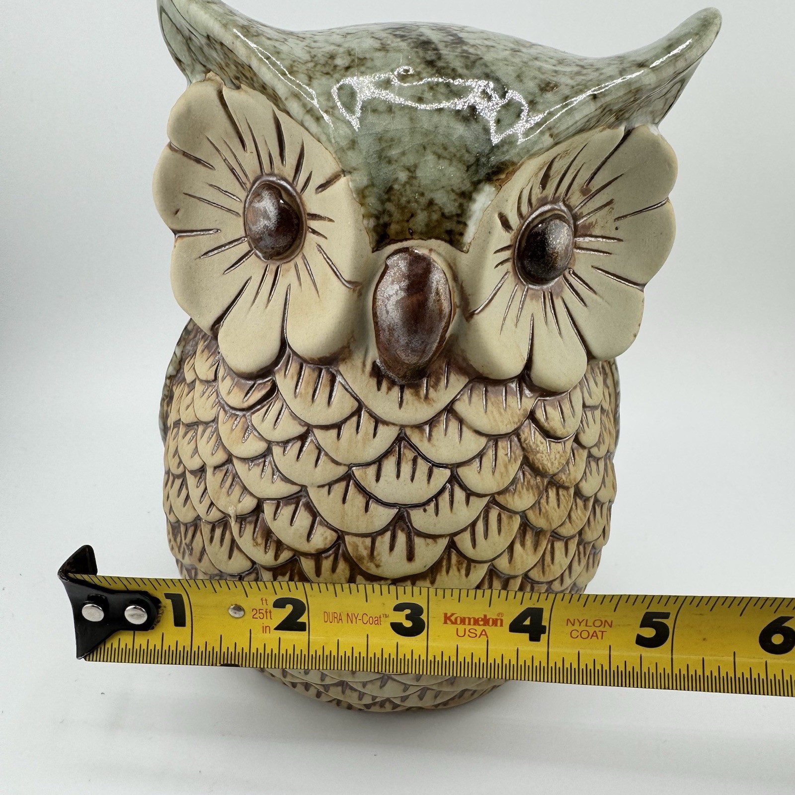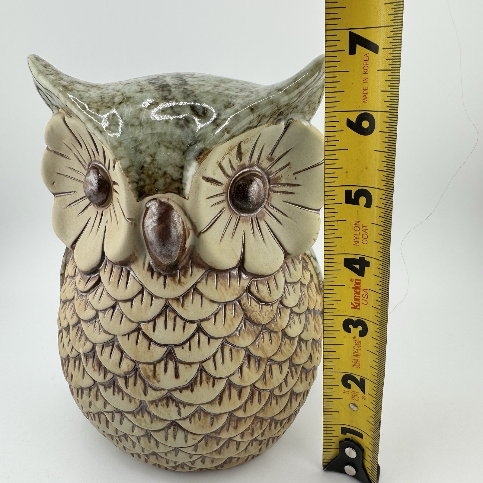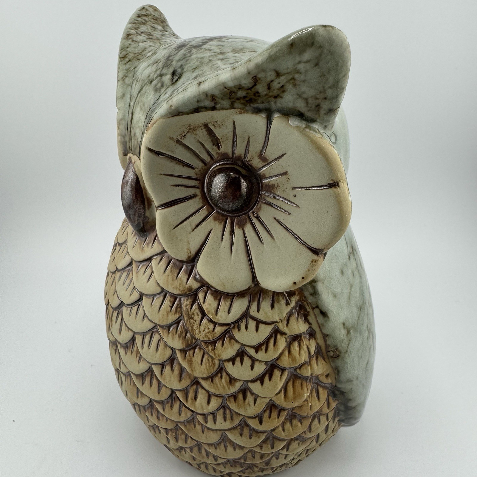 Vintage Ceramic Owl Coin Bank Green Brown Glaze Feather Texture 7