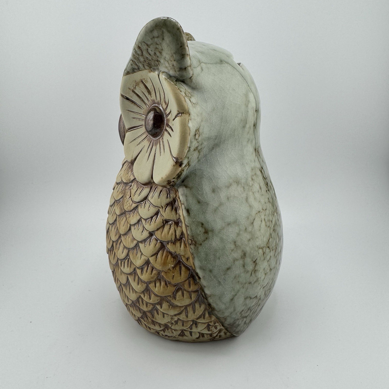 как выглядит Vintage Ceramic Owl Coin Bank Green Brown Glaze Feather Texture 7 фото