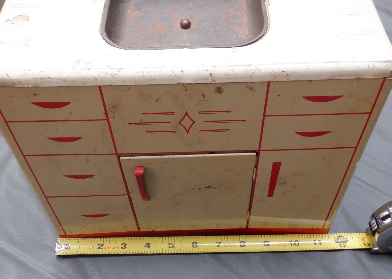 как выглядит Vintage Wolverine Supply Mfg Co Tin Toy Childs Kitchen Set Sink Fridge Stove фото