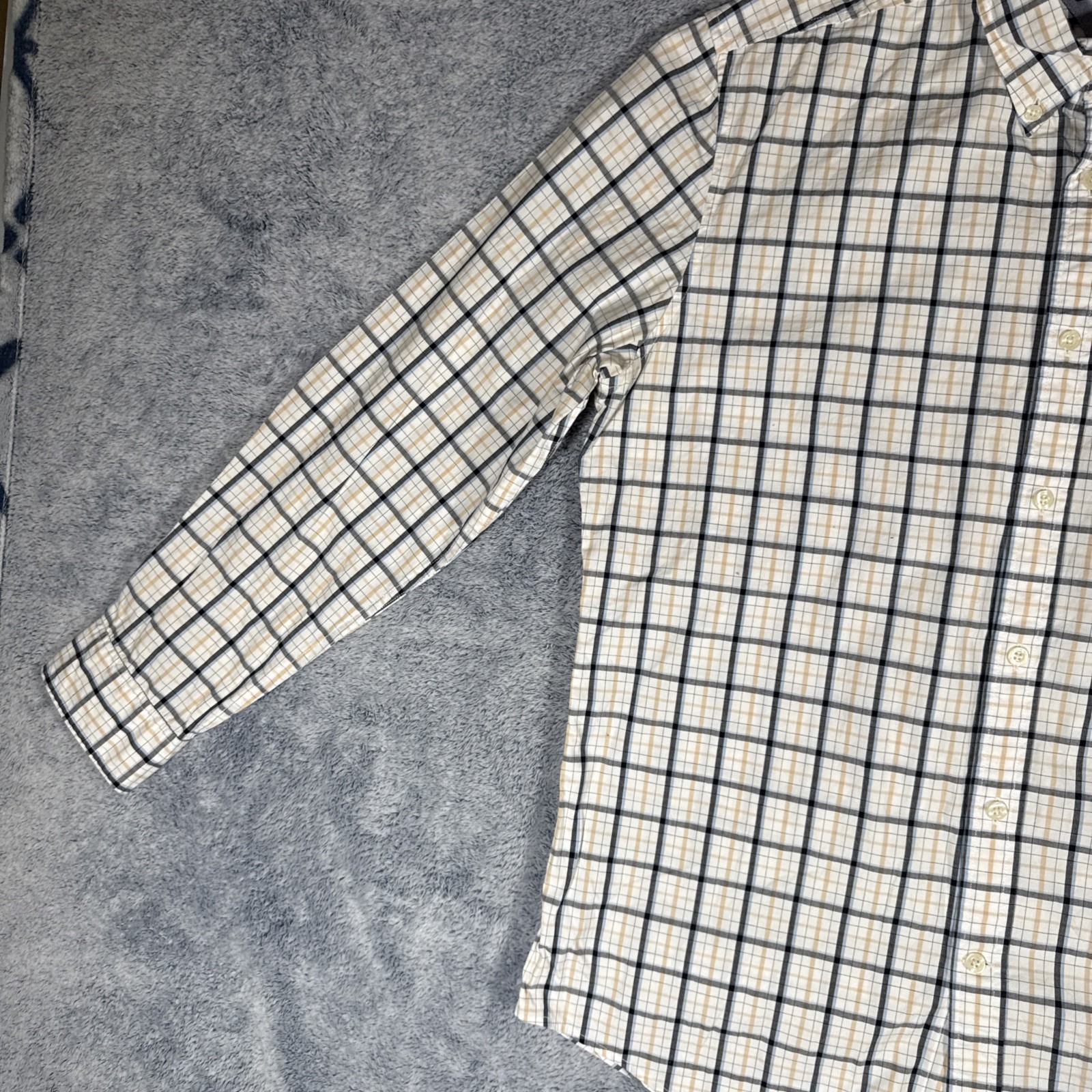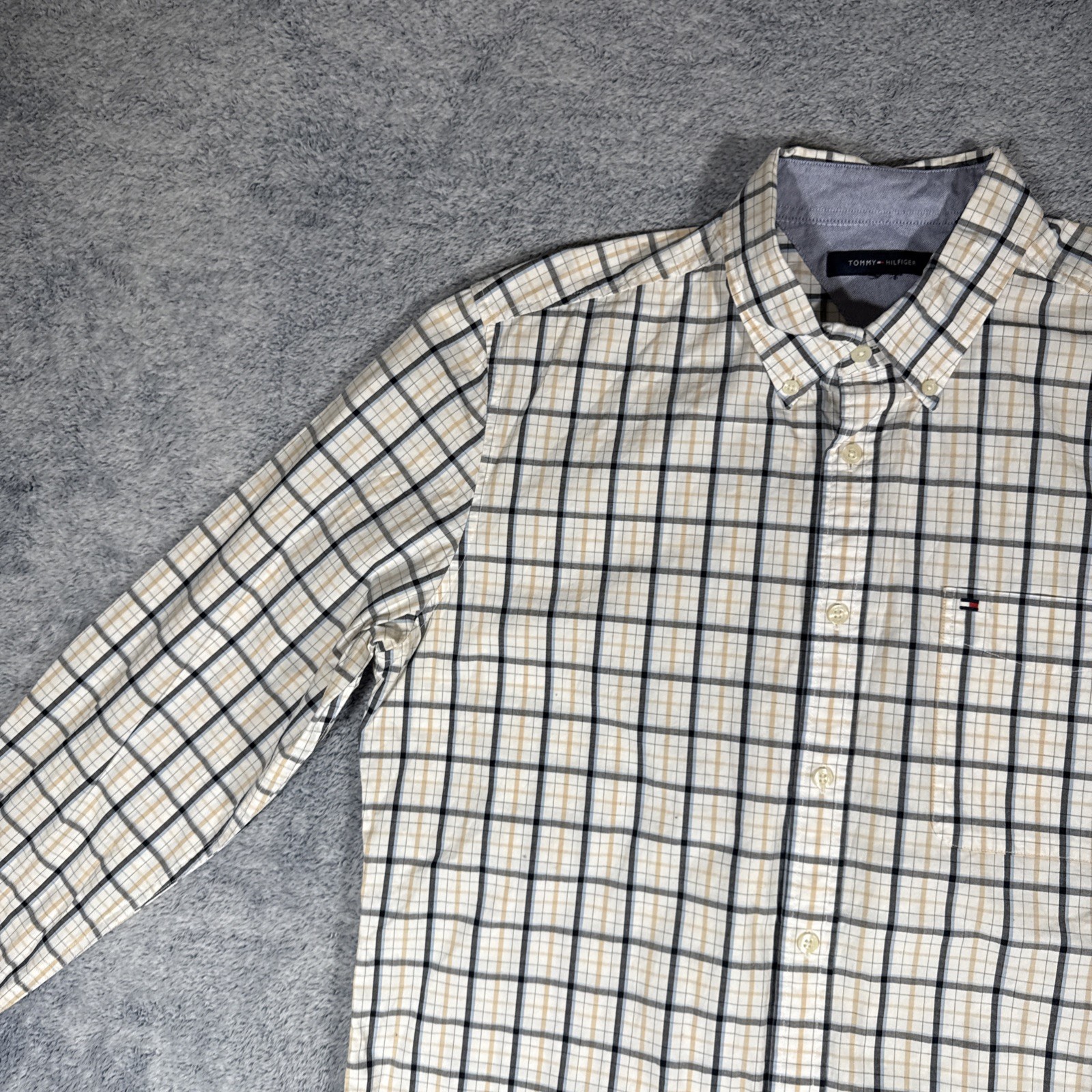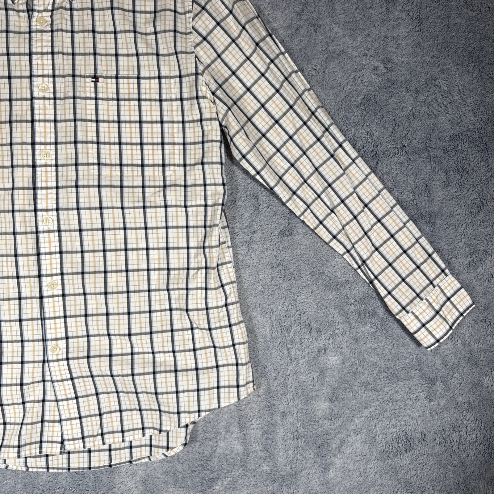 как выглядит Tommy Hilfiger Button Up Dress Shirt Mens L White Gray Tan Plaid Pocket Logo фото