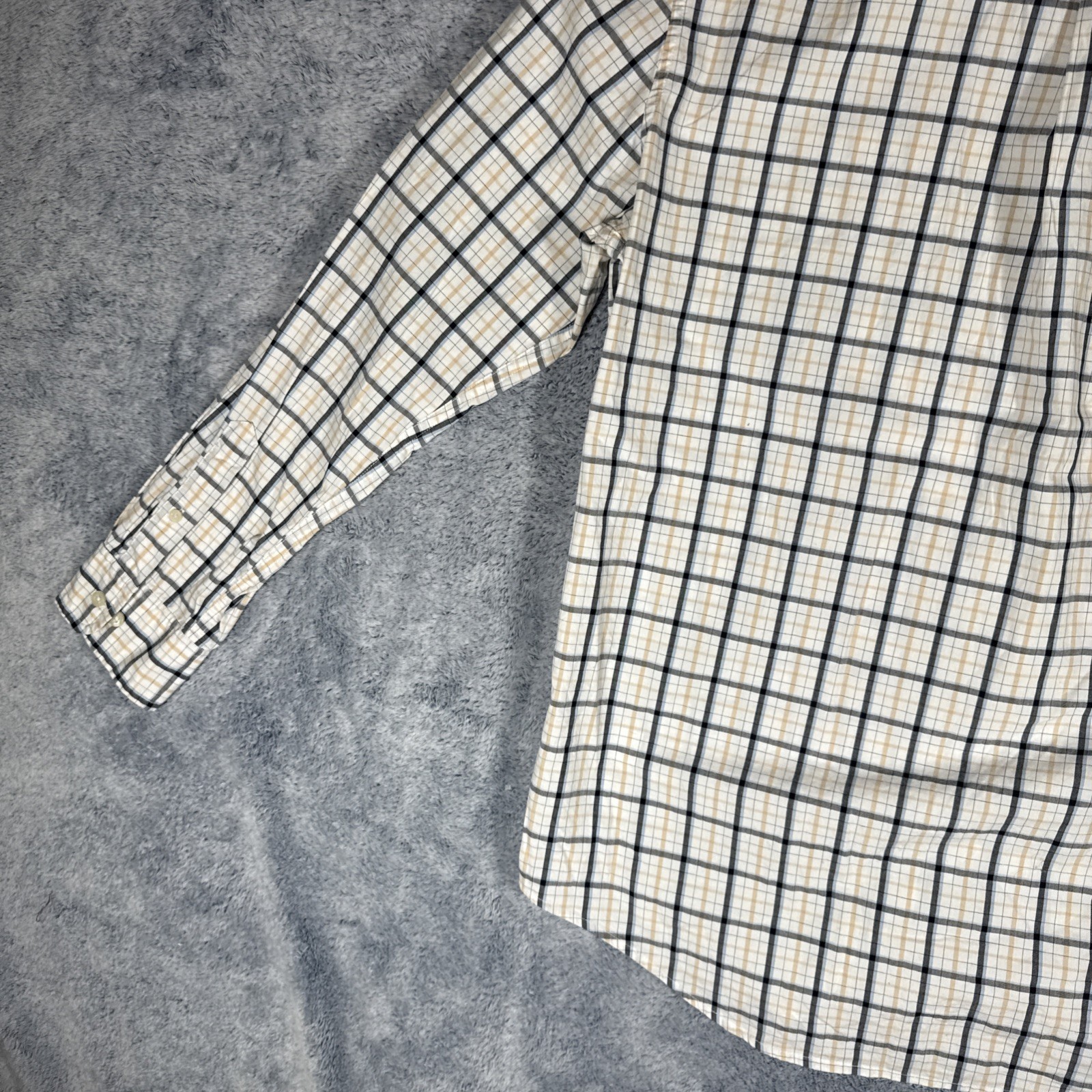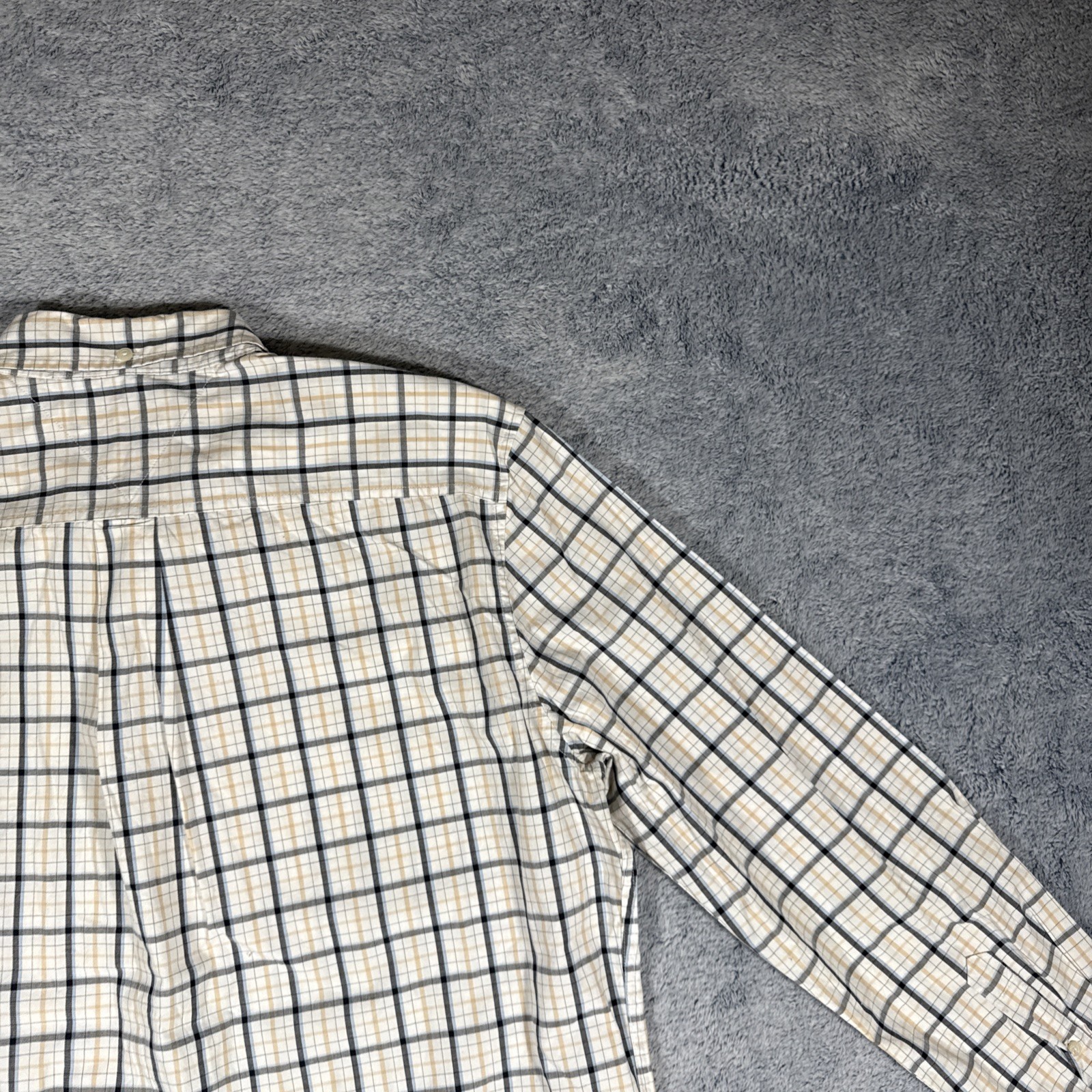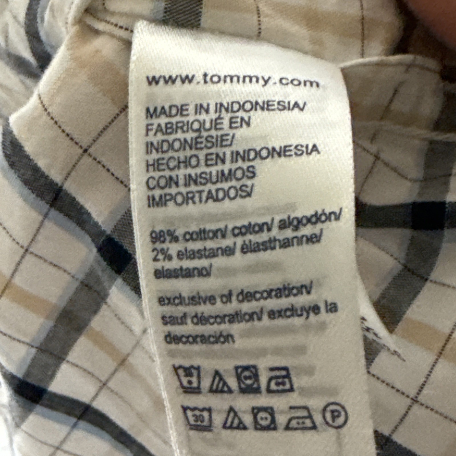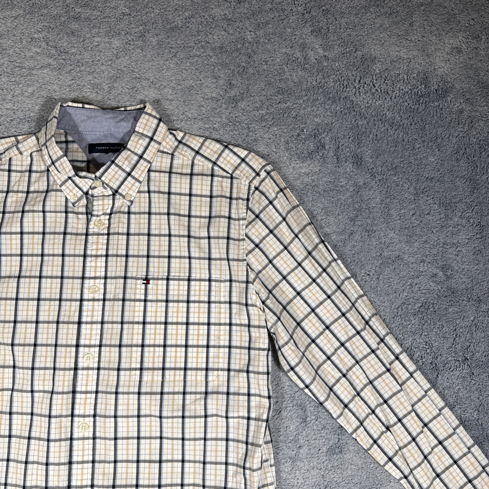 Tommy Hilfiger Button Up Dress Shirt Men's L White Gray Tan Plaid Pocket Logo