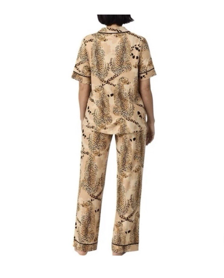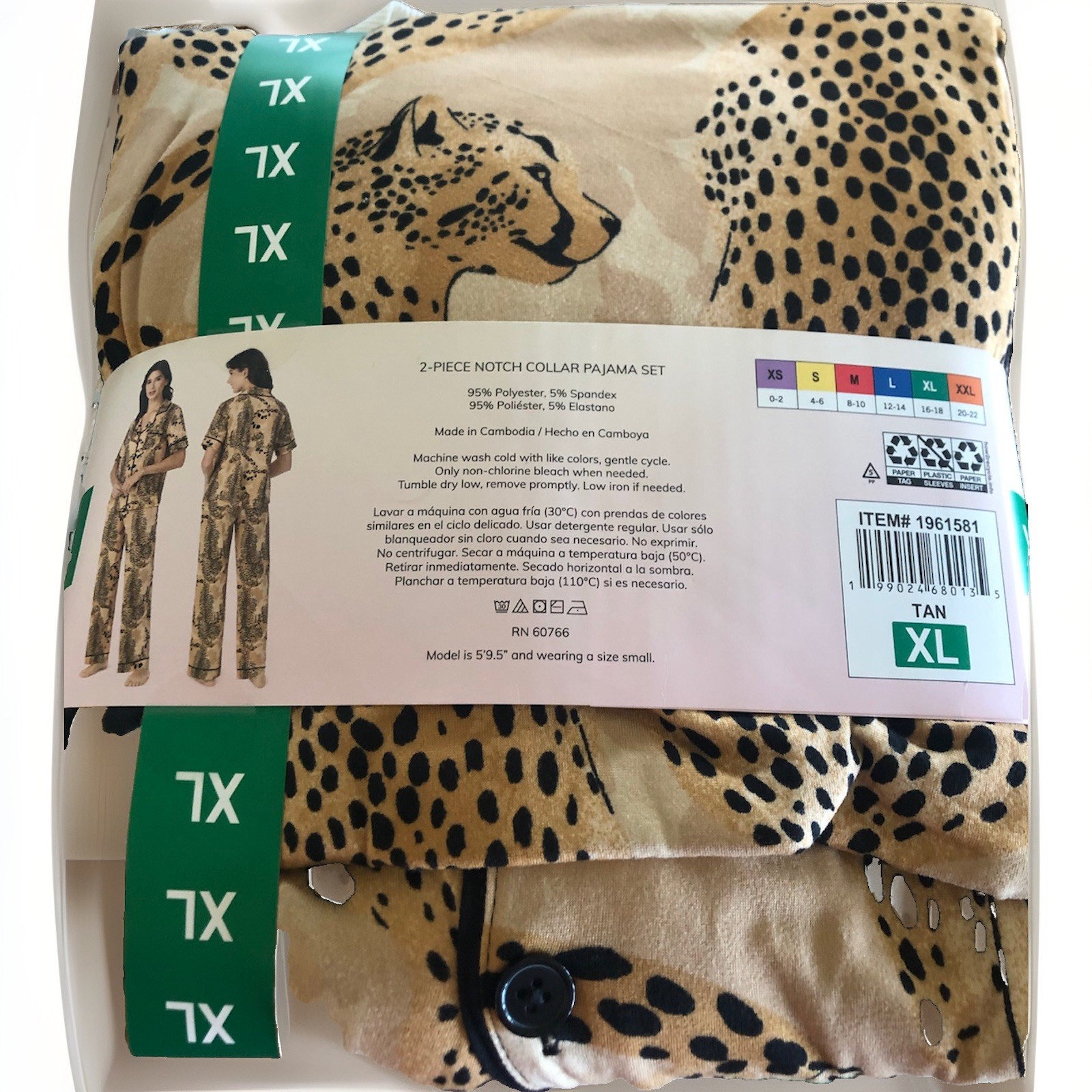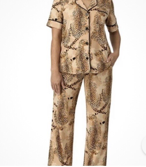 Room Service Womens 2PC Notch Collar Pajama Set, NWT Leopard Tan/Black, L , Soft