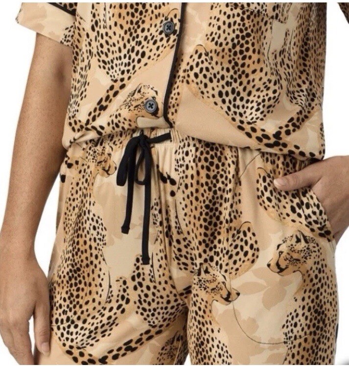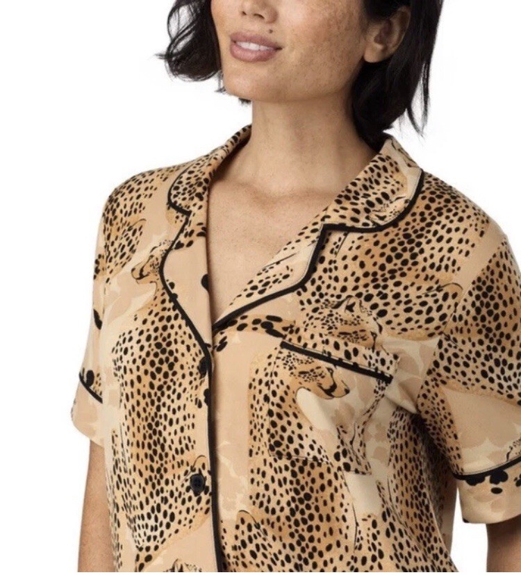 как выглядит Room Service Womens 2PC Notch Collar Pajama Set, NWT Leopard Tan/Black, L , Soft фото
