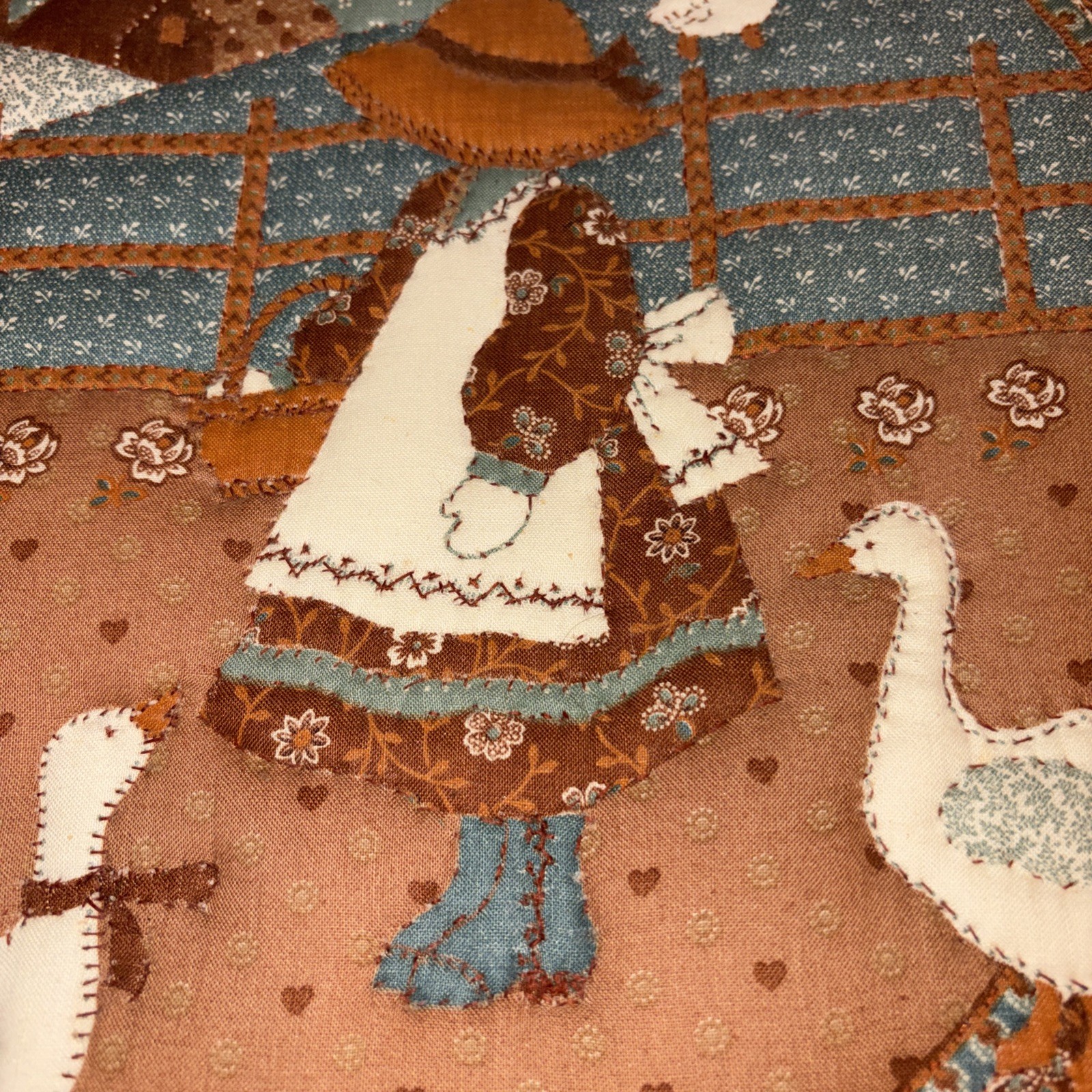 Handmade fabric appliqu d machine stitching inside a wooden embroidery hoop.