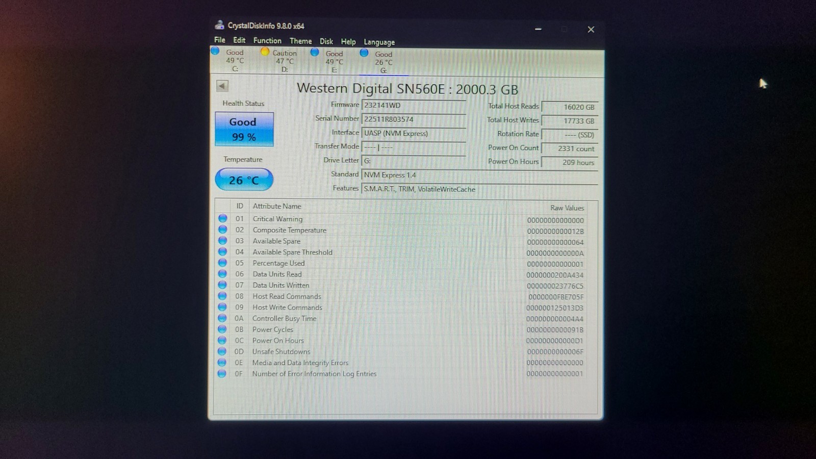 SanDisk Extreme 2TB V2 gen2 External SSD SDSSDE61-2T00-G25 plugged for 209hours