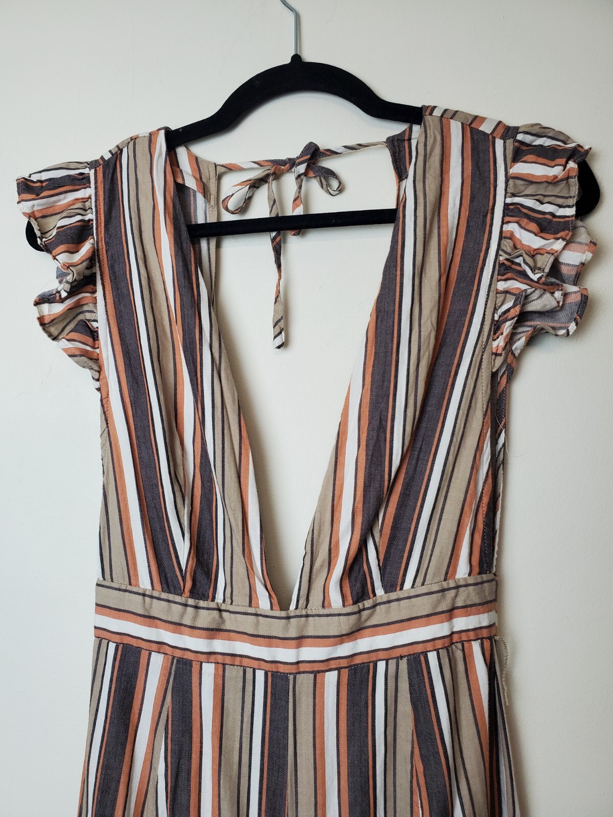 STORIA Womens Small Jumpsuit Striped Wide-Leg Ruffles Lowcut V-Neck