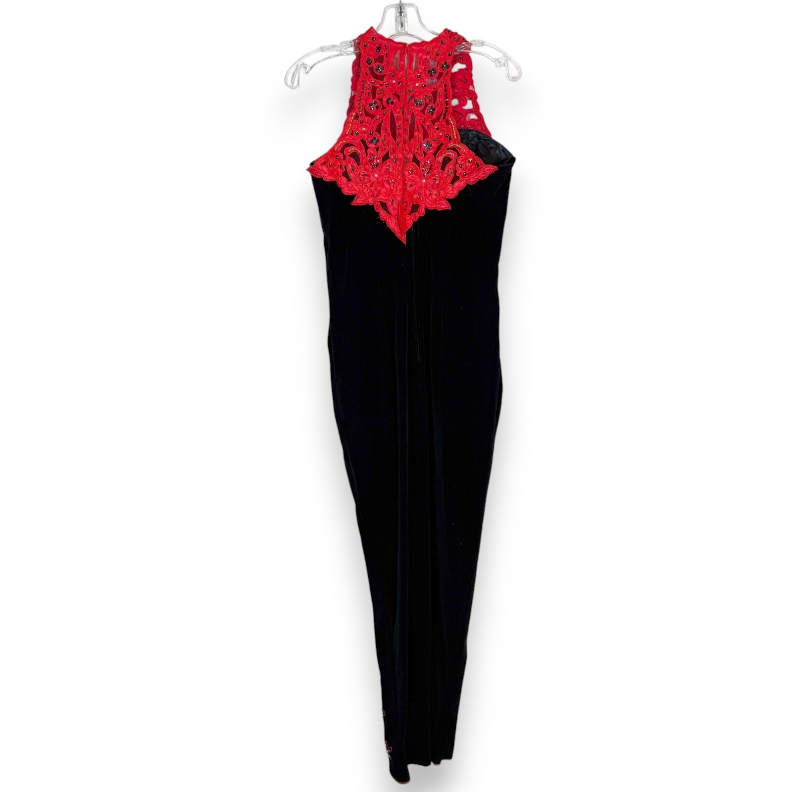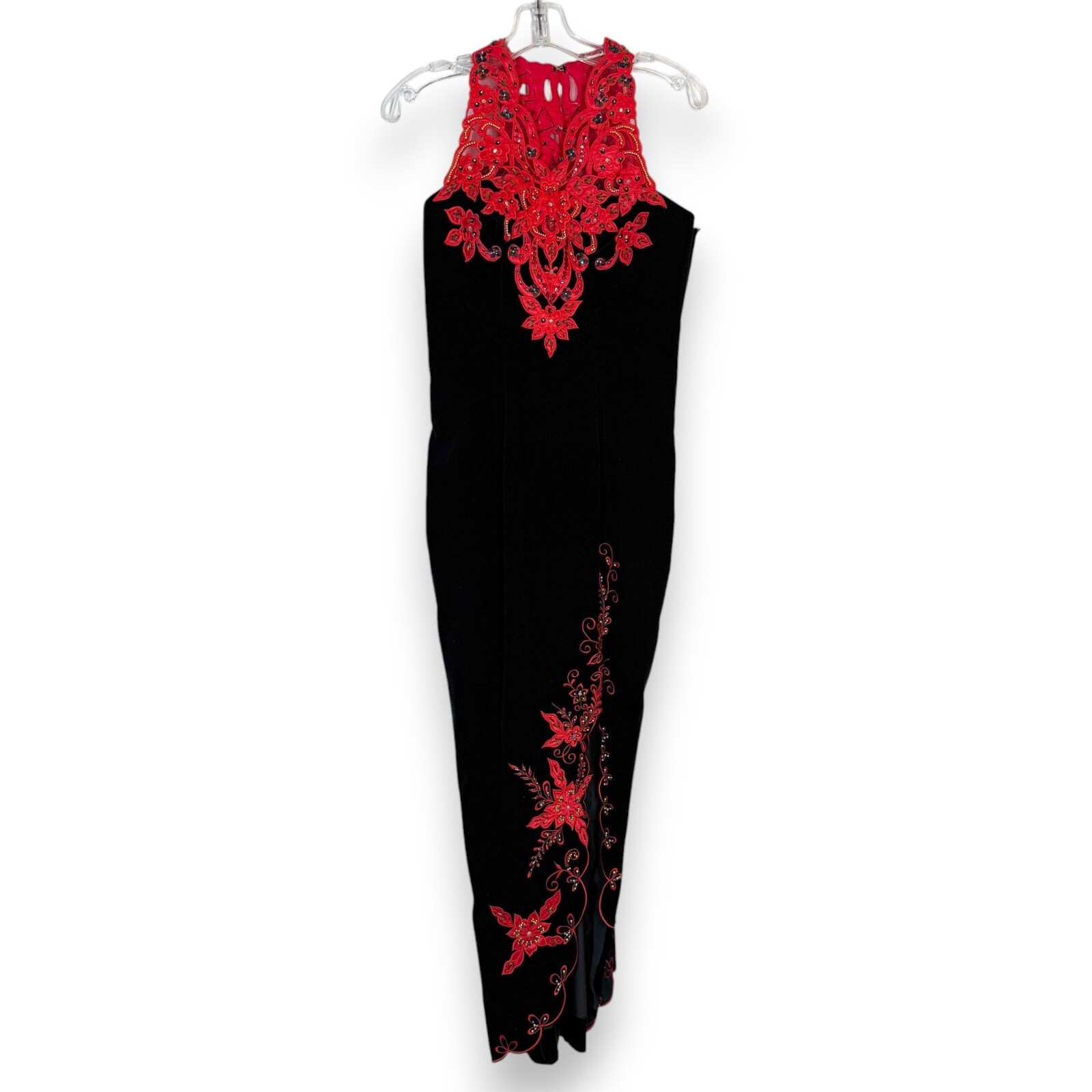 Vintage Cheongsam Qipao Dress Gown XS Black Velvet Red Long Maxi Holiday Slit