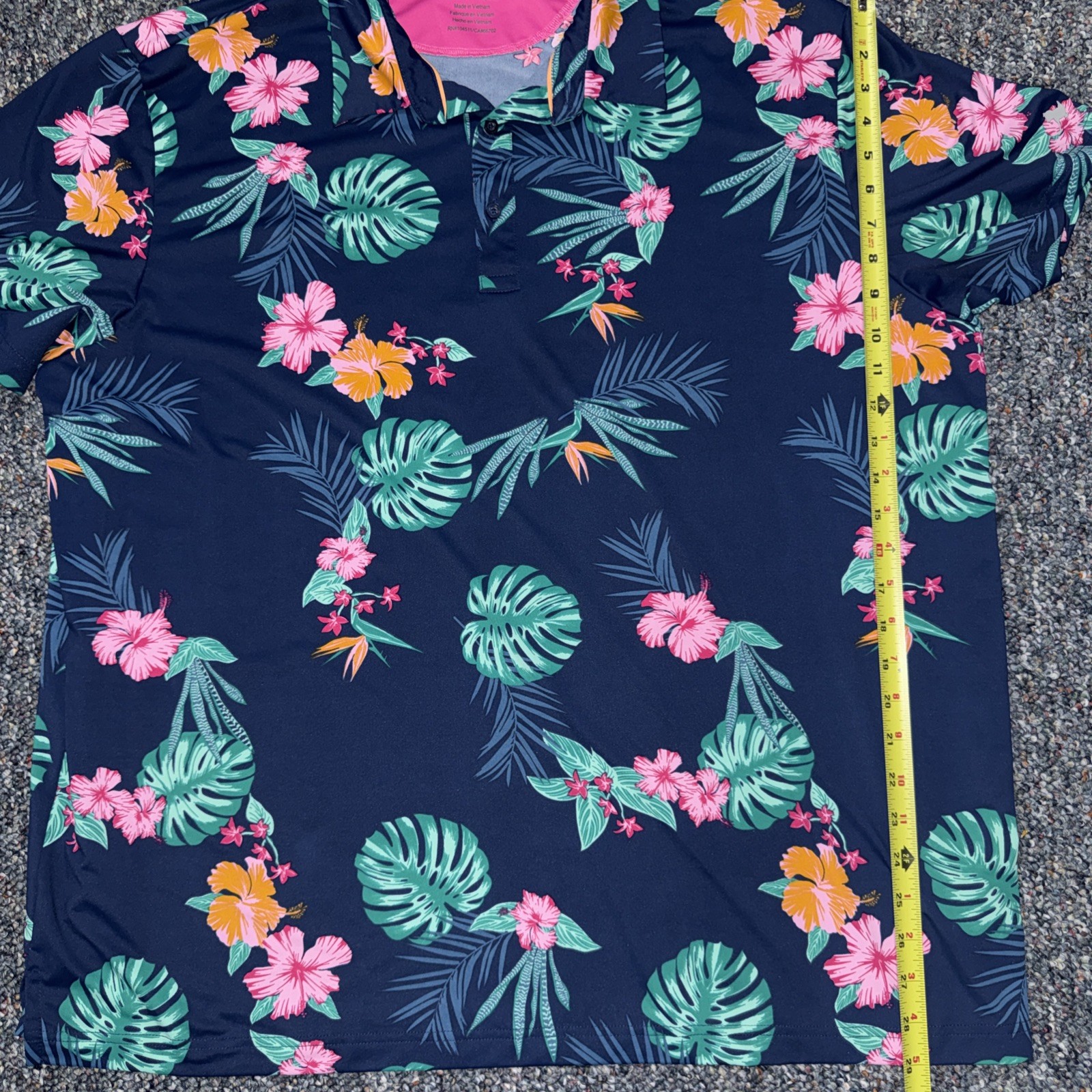 Birdie Bound Mens Navy Green Pink Tropical Hibiscus Floral Golf Polo Size 3XL/TG