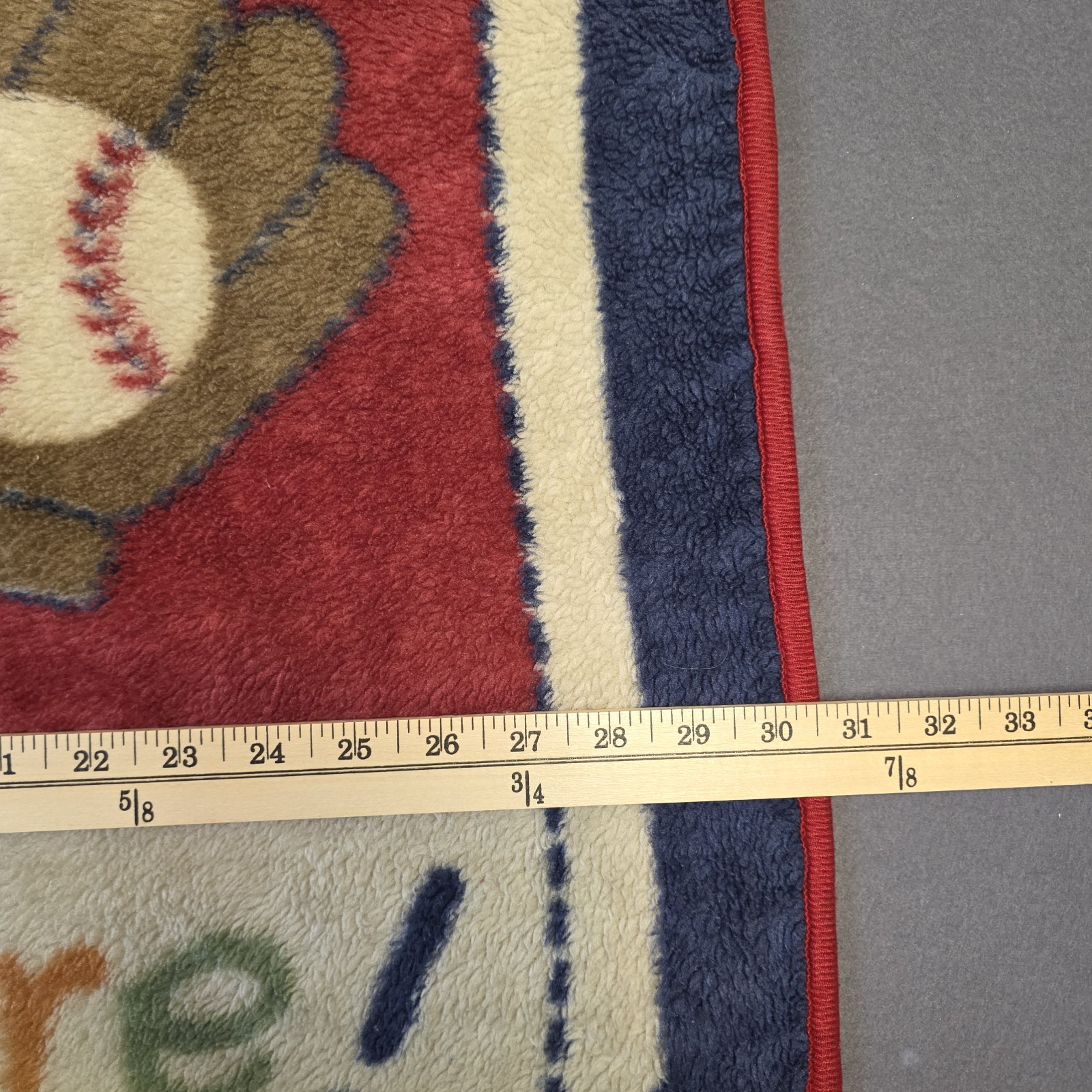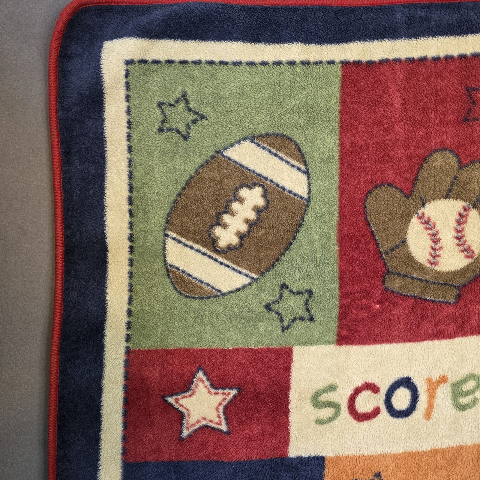 Vtg Nojo Sports Themed Plush Toddler Baby Blanket SCORE Red Trim Football Soccer