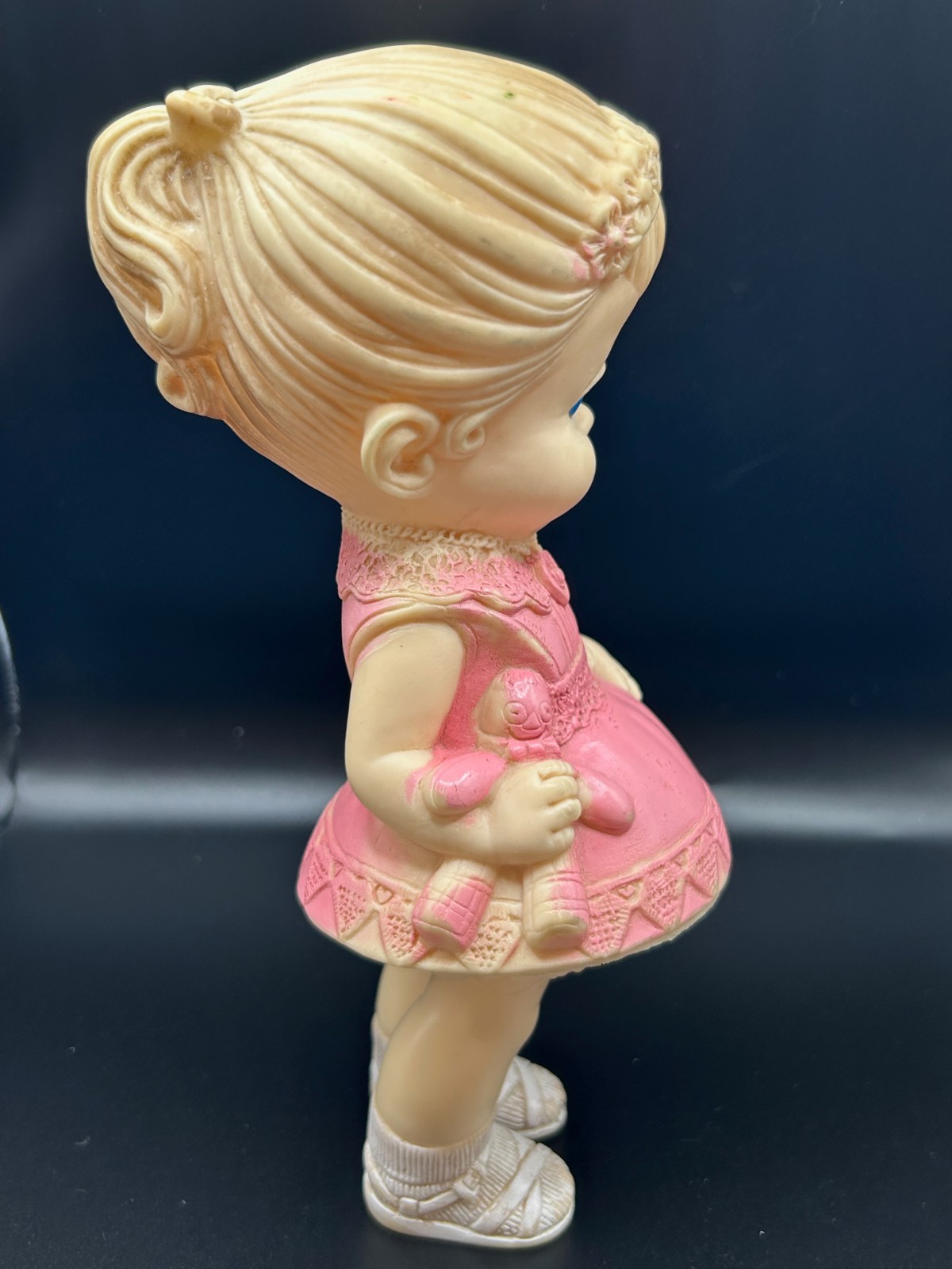 1958 EDWARD MOBLEY SQUEAK TOY DOLL PINK DRESS BLUE EYES GIRL ARROW RUBBER 8H