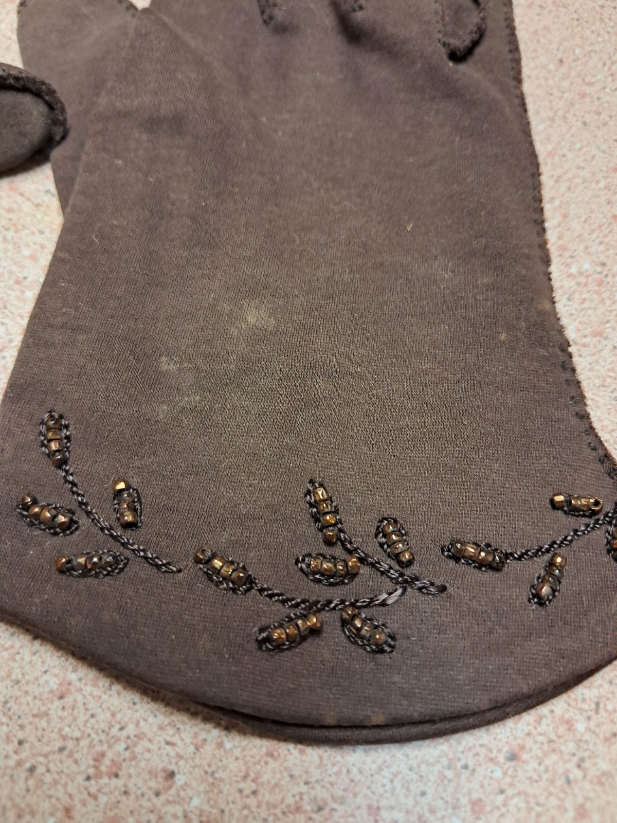 как выглядит Vintage 1950s beaded Brown Stretch Nylon Formal gloves MCM фото