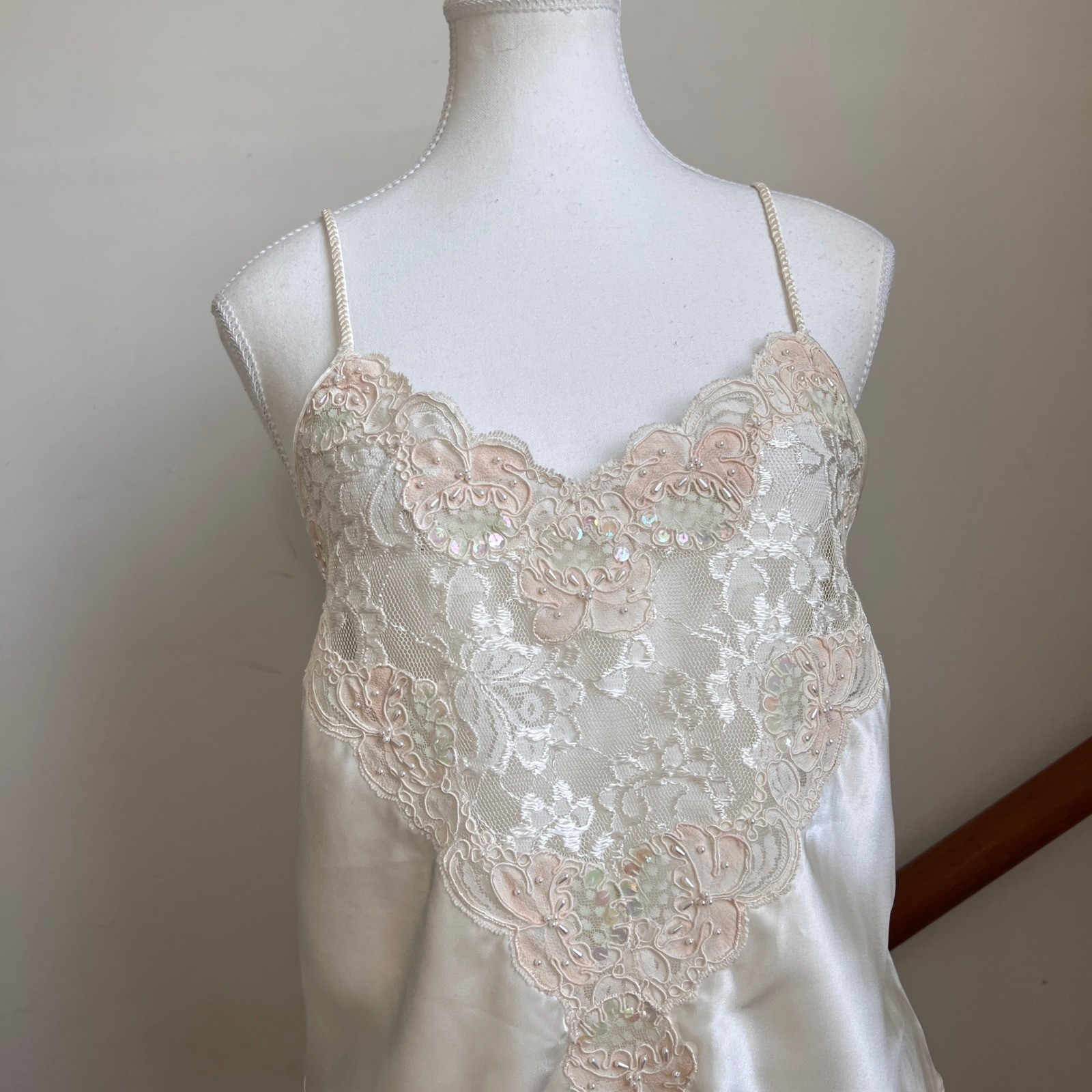 как выглядит Vintage Victorias Secret Camisole Ivory Lace Sequin Beaded Satin Cami Top 80s фото