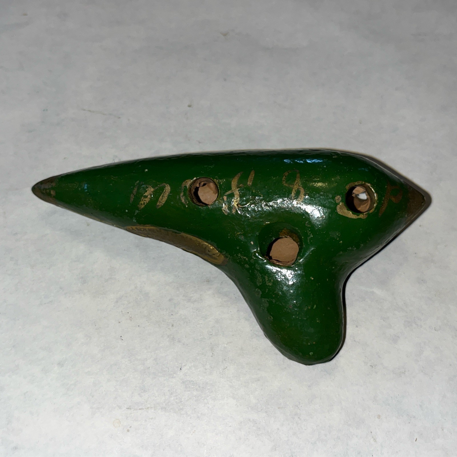 H. FIEHN Ocarina B2 Germany Green Antique Gold Hand Painted Clay Flute 4.5