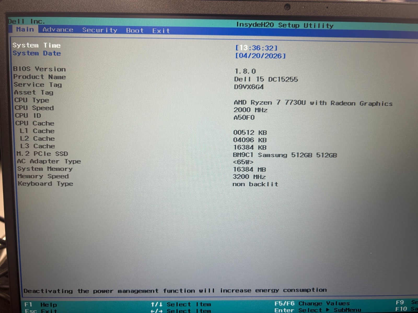 DELL 15 DC15255 G8MK9, AMD Ryzen 7 7730U, 2.00 GHz, 16 GB RAM, 512 GB NVMe