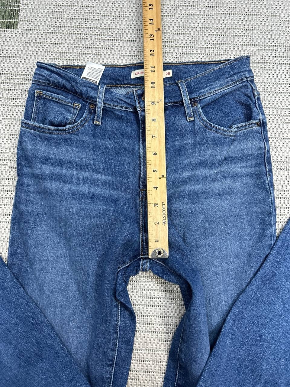 как выглядит Levis 724 High Rise Straight Jeans Women 28 Blue Denim Logo Cotton Stretch 26x29 фото