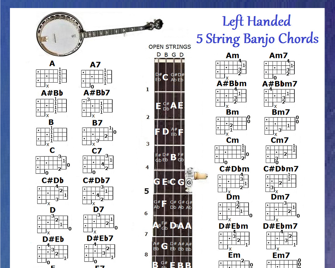 LEFT HANDED 5 STRING BANJO CHORDS CHART NOTE LOCATOR - SMALL CHART - LEFTY