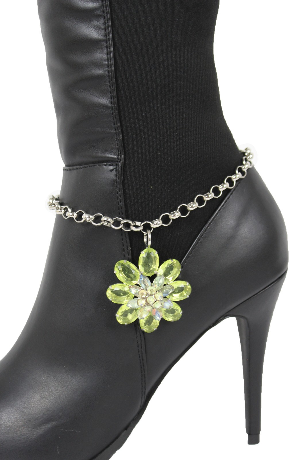 Women Silver Metal Chain Boot Bracelet Shoe Green Flower Charm Jewelry Anklet