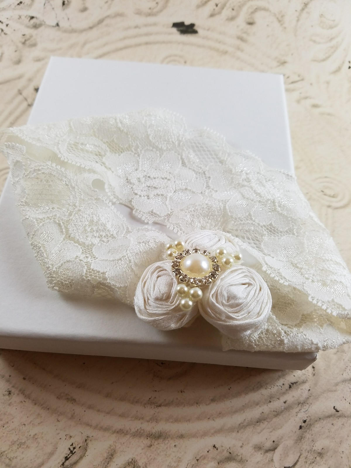 как выглядит BRIDAL Wedding Garter Set, Lace HANDMADE IVORY Rosettes, Pearls Rhinestones фото