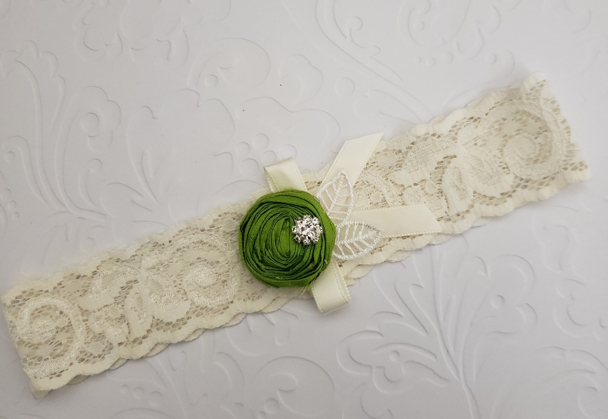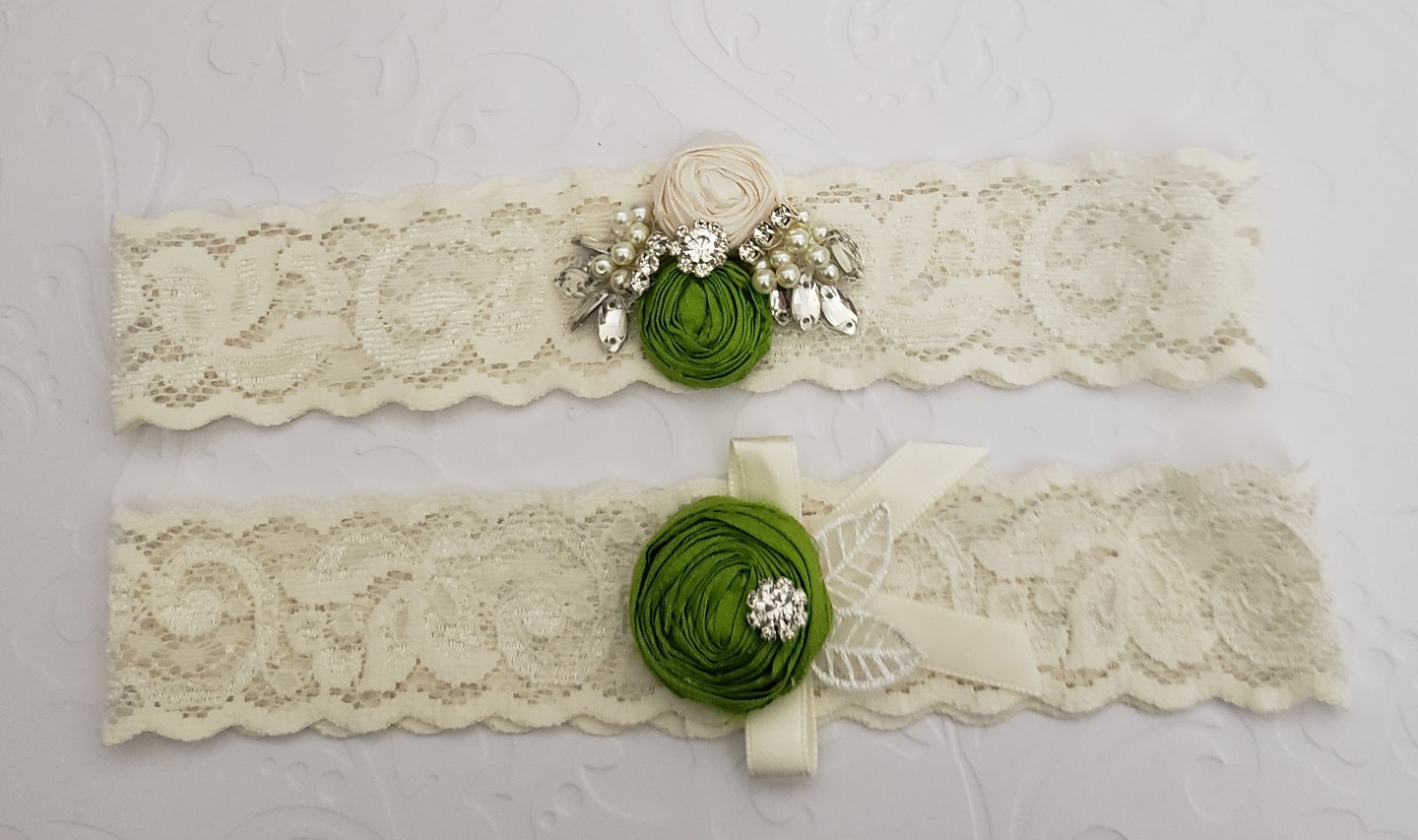BRIDAL Wedding Garter Set, Lace HANDMADE Green Apple Rosettes Rhinestones Pearl