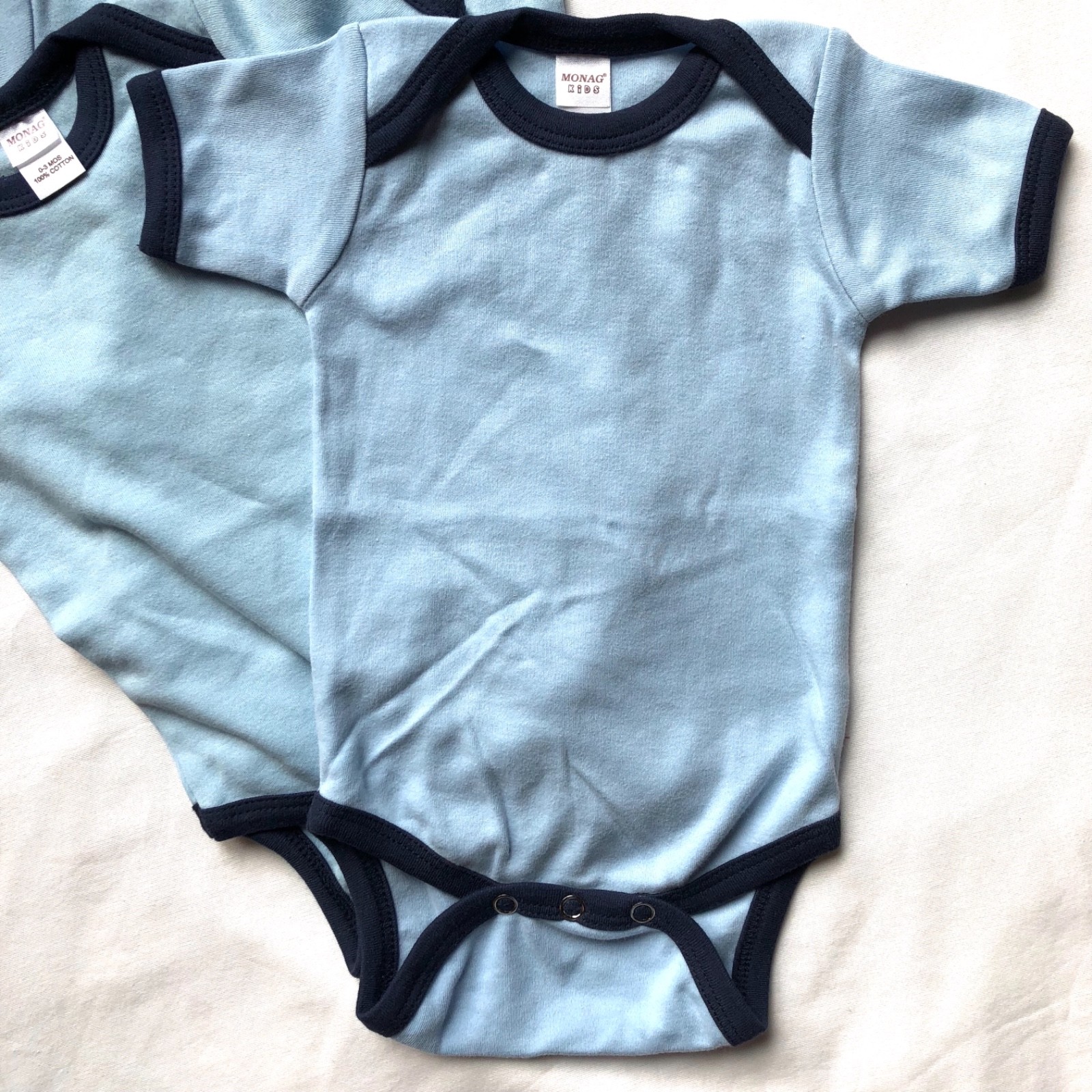как выглядит 6 New 0-3 Month Monag Baby Bodysuits Lot Blue Tan You Choose Color Bundle фото