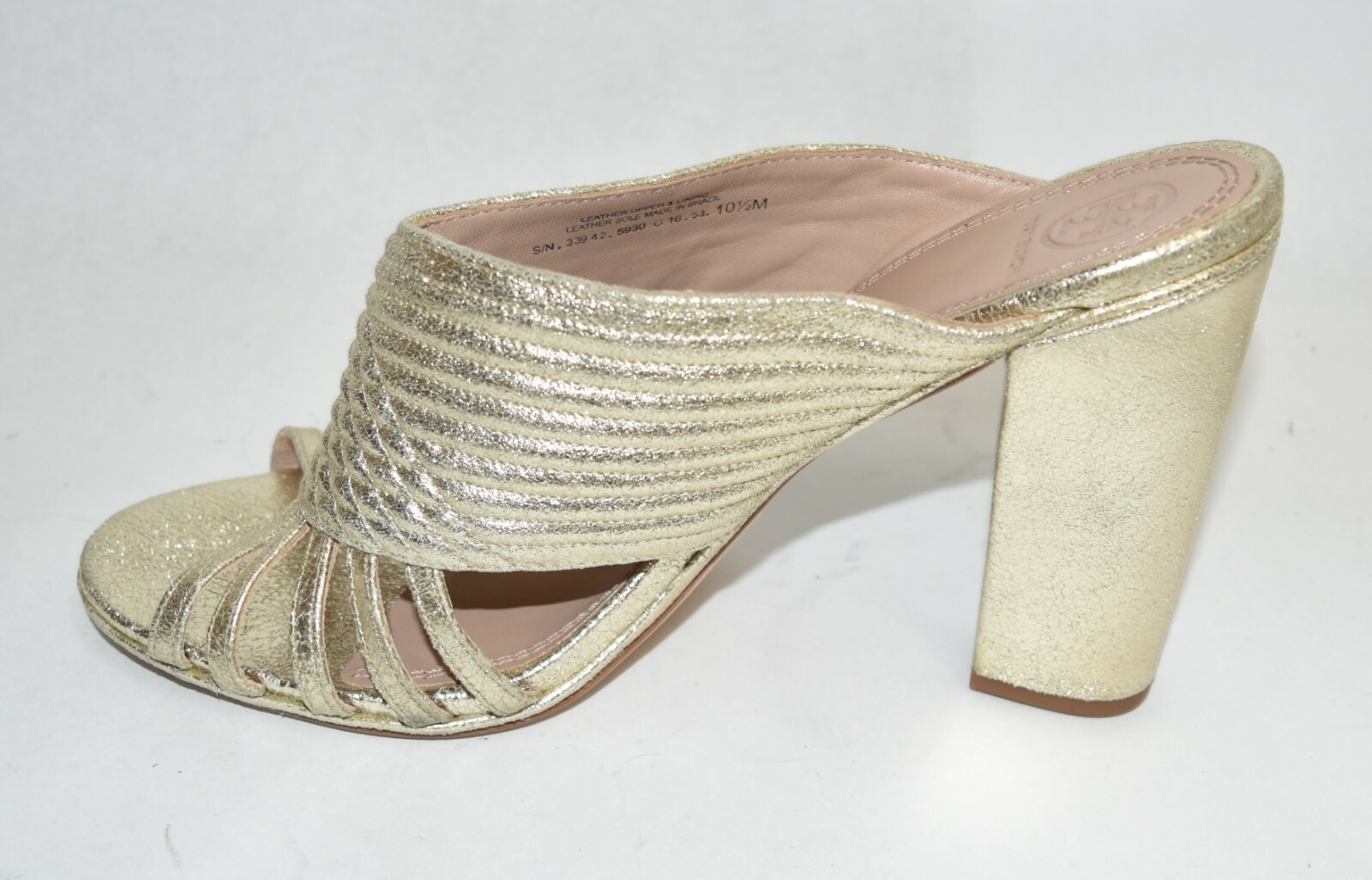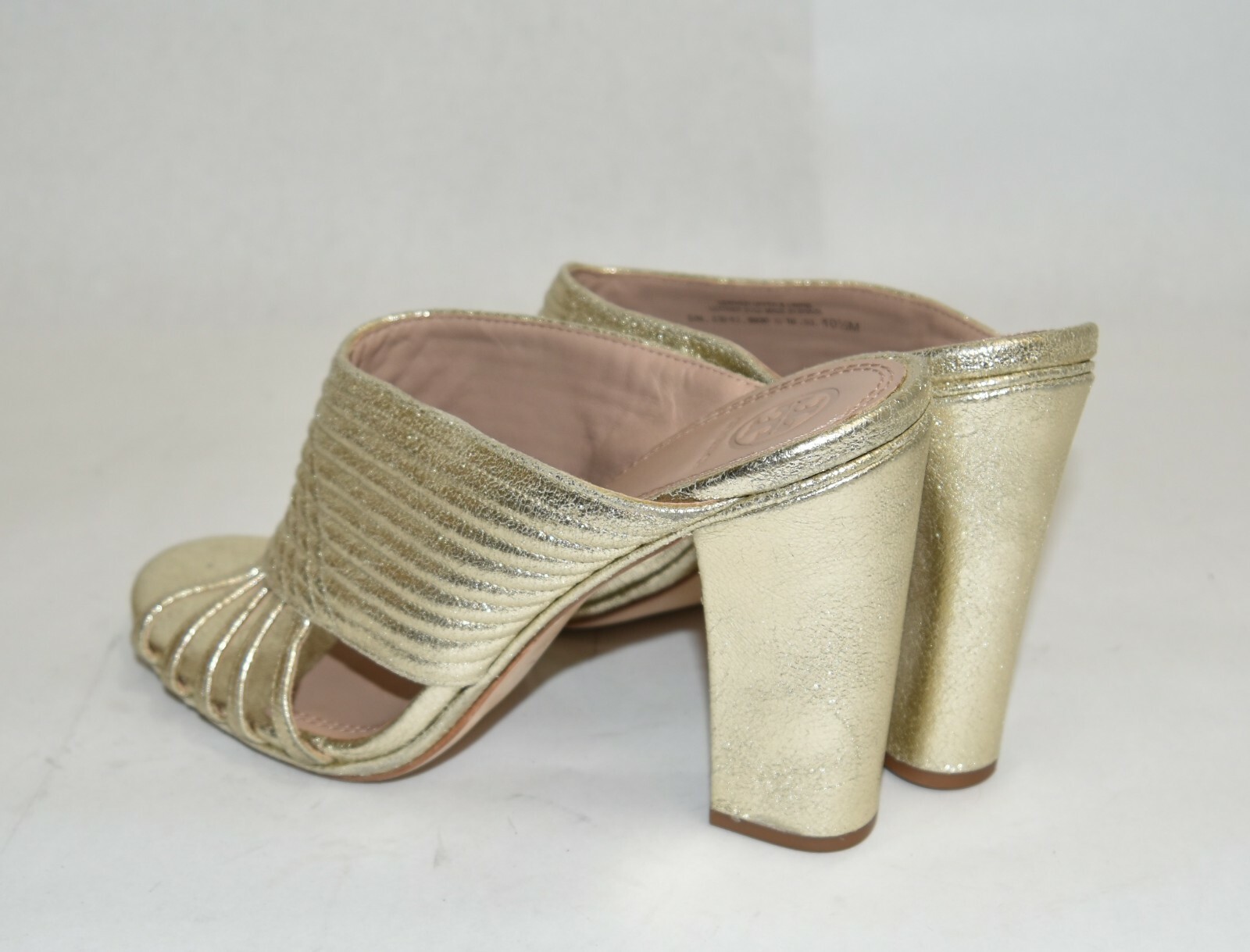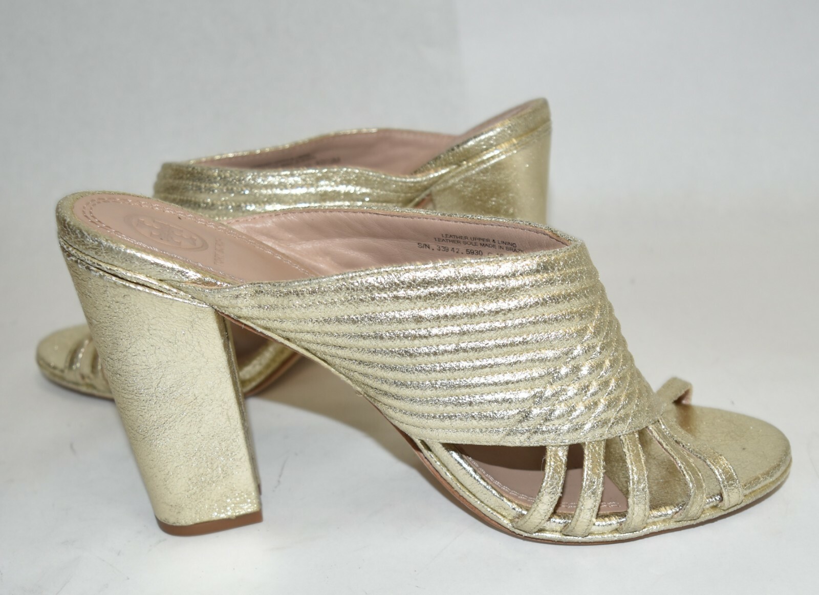 New Tory Burch Brida Metallic Leather Gold Peep Toe Mules Size 10.5 MSRP 350