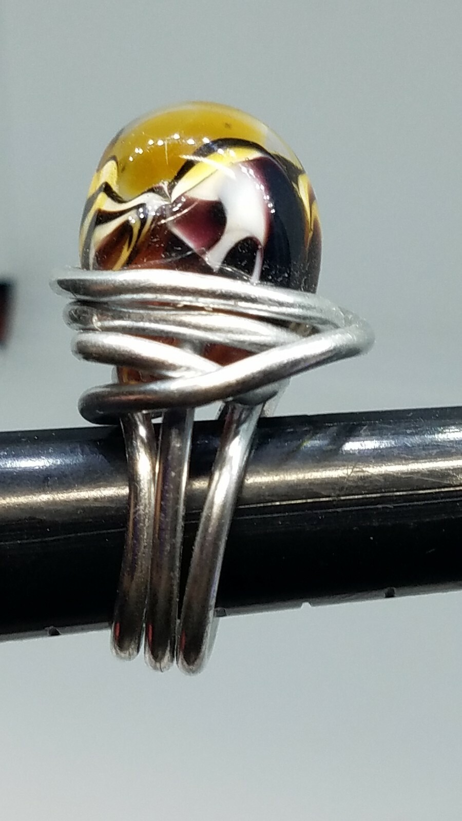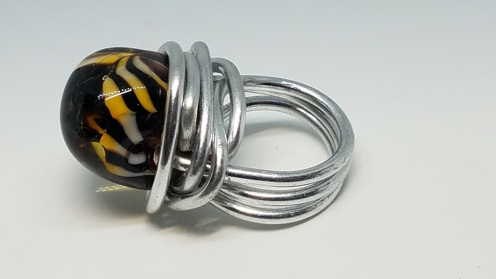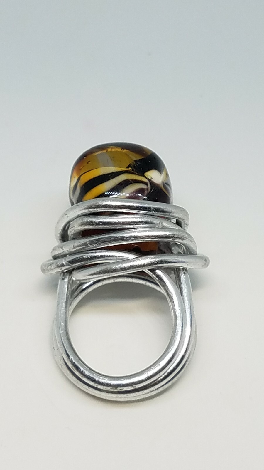 Artisan Art Glass Bead Silver Tone Wire Chunky Ring Size 8