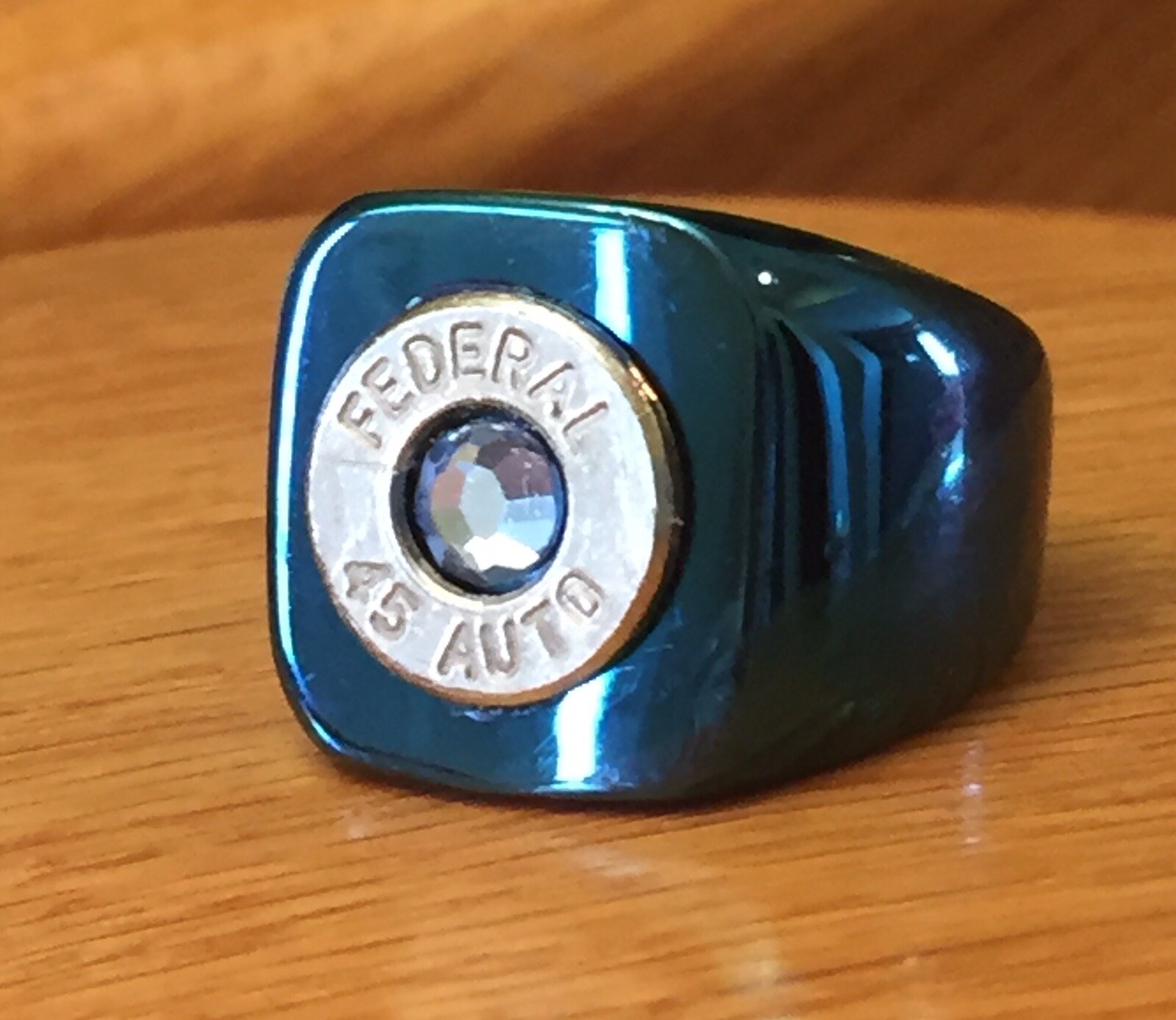 Federal 45 Caliber Nickel Bullet Casing Blue Steel Ring Sz 6.5 W/Lt Blue Crystal