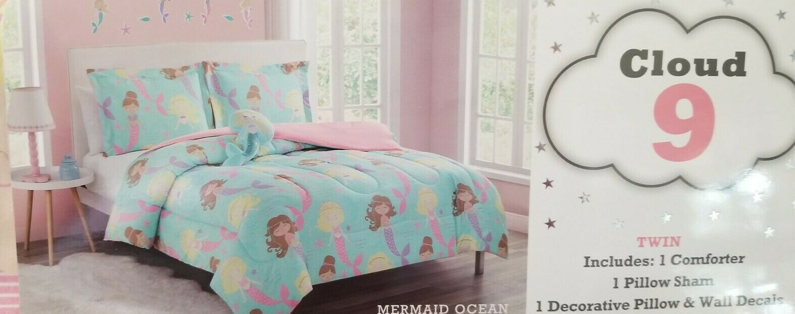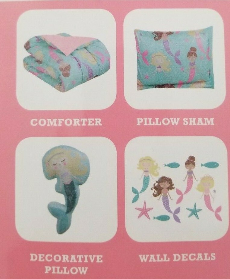 4 pc Cloud 9 Mermaid Ocean Twin Comforter, Sham, Deco Pillow, Wall Decal Set NIP